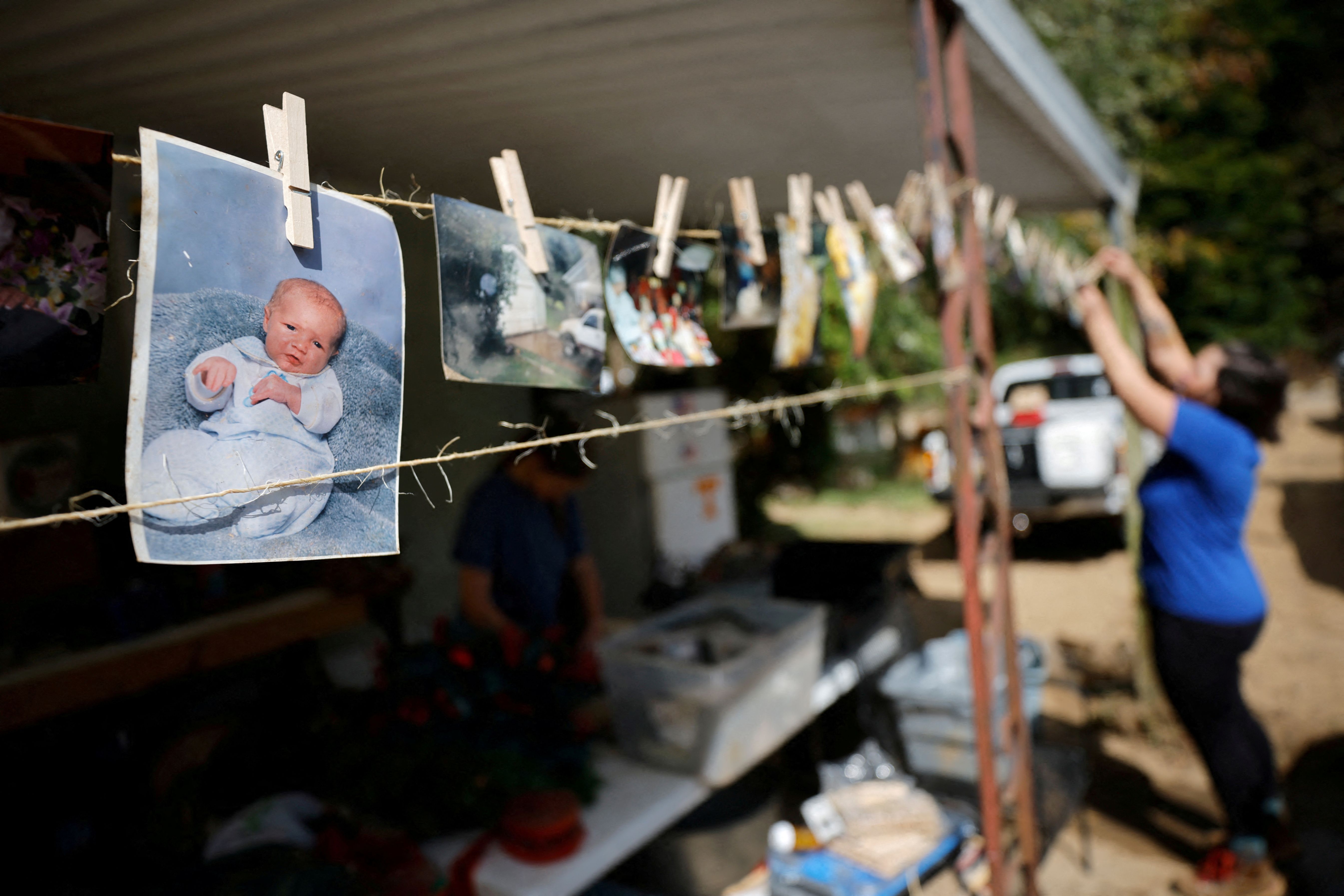 A person helps wash and dry photographs that were submerged in flood waters at the home of people impacted by Hurricane Helene, in Cruso, North Carolina on October 3, 2024. (Photo by Jonathan Drake/Reuters)
