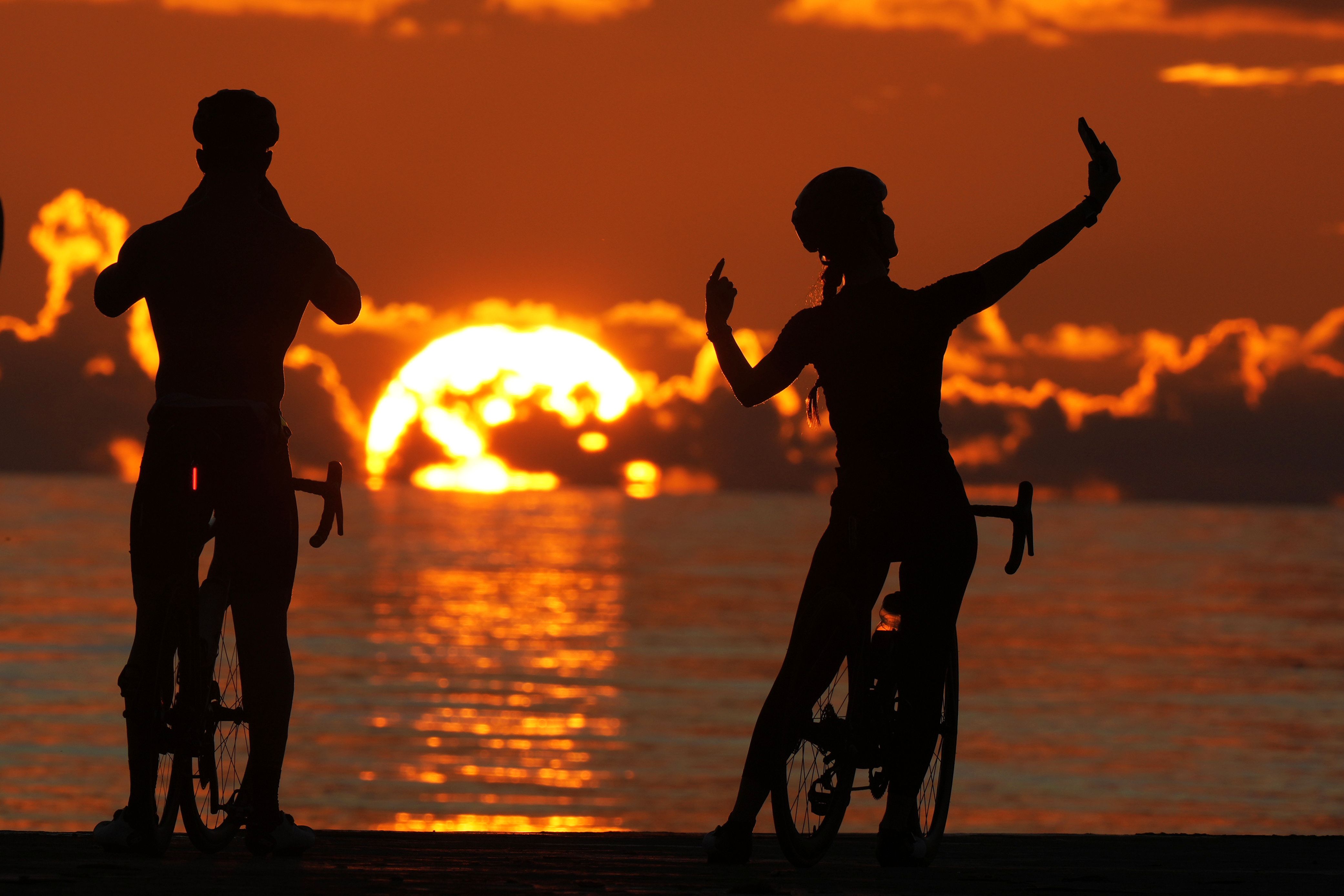 A pair of cyclists take photos as the sun rises over the Atlantic Ocean, Thursday, October 3, 2024, in Bal Harbour, Fla. (Photo by Wilfredo Lee/AP Photo)
