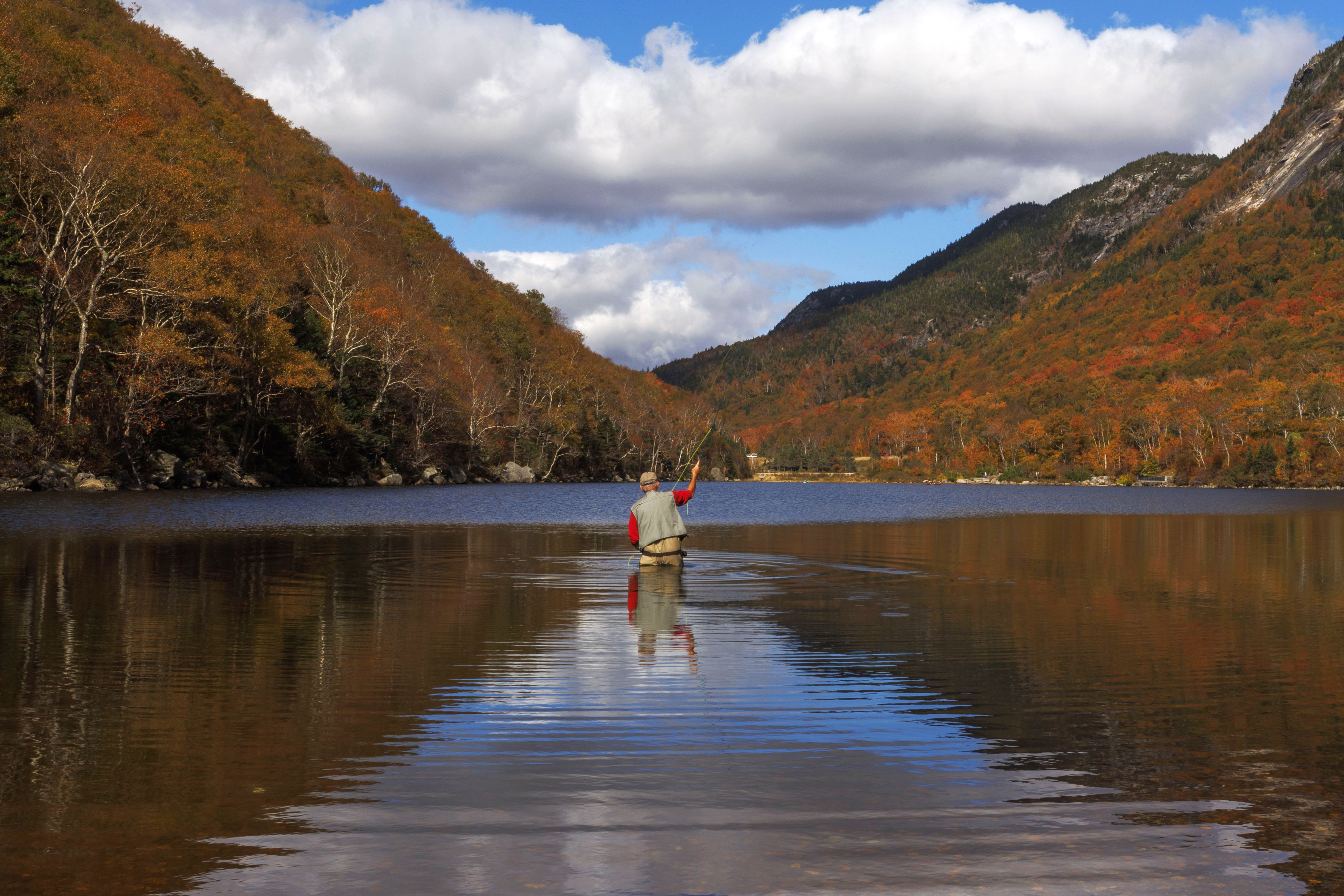 A man fly fishes in Profile Lake while surrounded by the fall foliage colors in Franconia Notch State Park in Franconia, New Hampshire, USA, 03 October 2024. The peak foliage season is beginning in New England. (Photo by Cj Gunther/EPA/EFE)