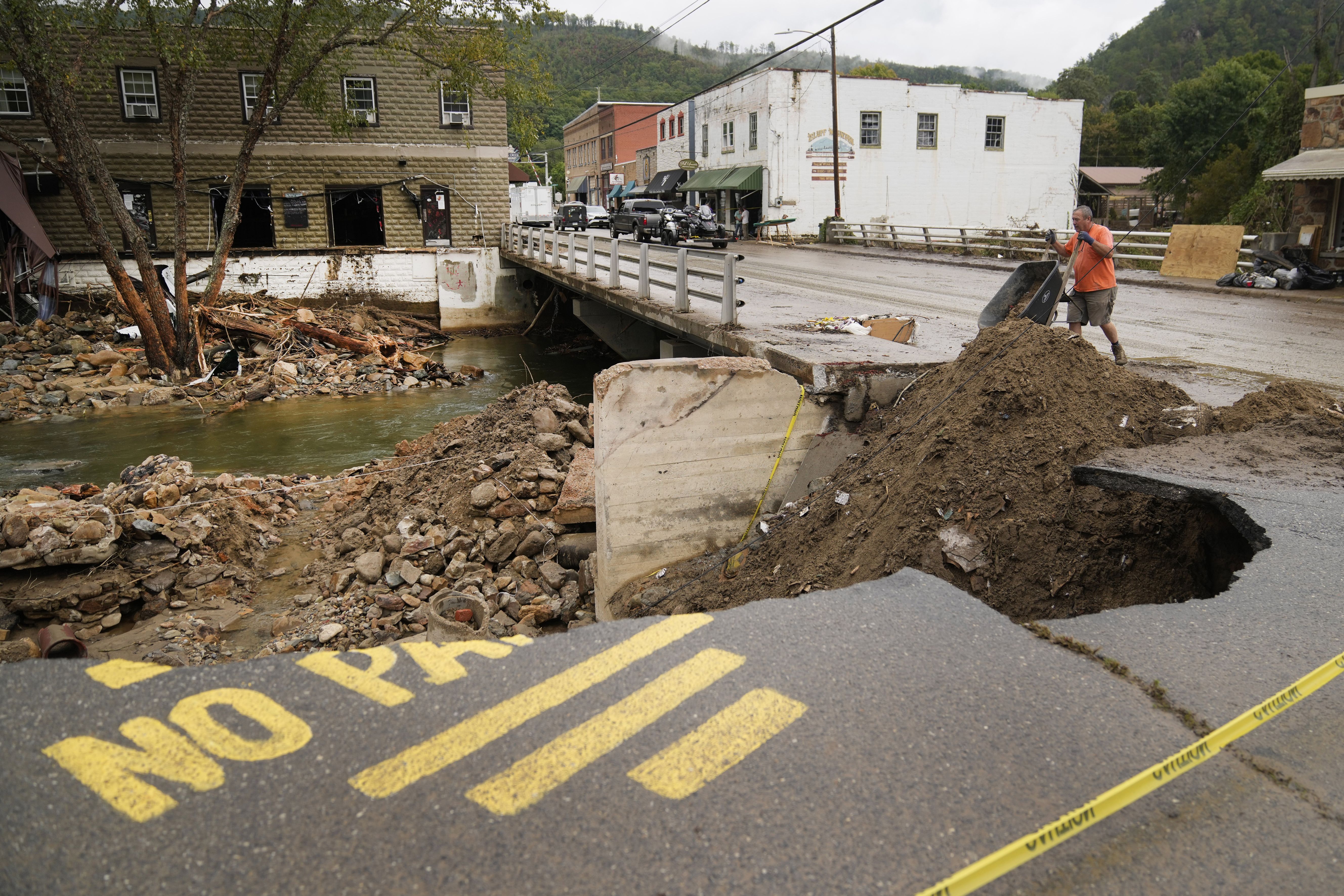 Len Frisbee dumps a wheelbarrow of dirt as he helps with clean up in the aftermath of Hurricane Helene Tuesday, October 1, 2024, in Hot Springs, N.C. (Photo by Jeff Roberson/AP Photo)
