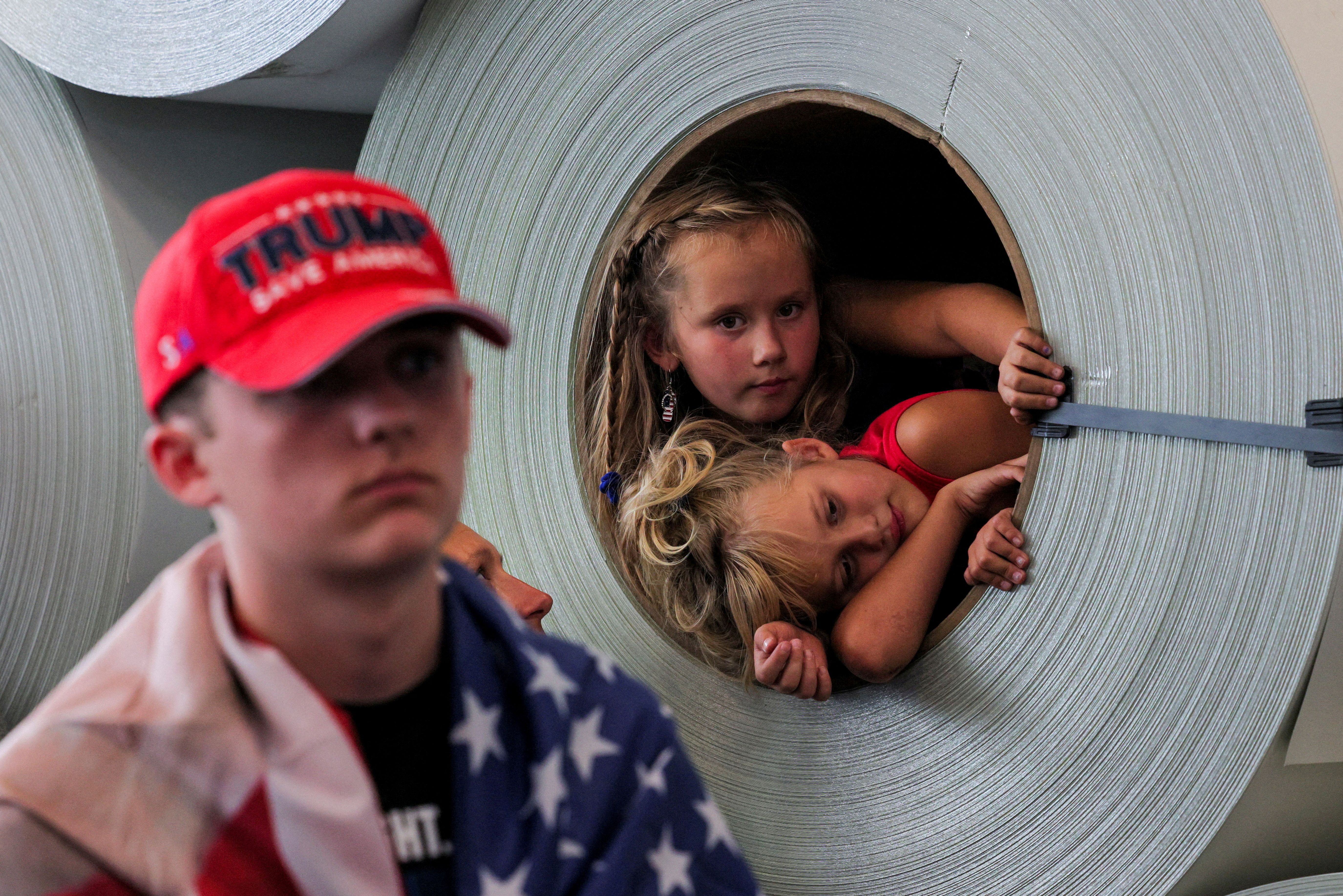 Children look on from inside a tube, as Republican presidential nominee and former U.S. President Donald Trump makes a campaign stop at manufacturer FALK Production in Walker, Michigan, U.S. September 27, 2024. (Photo by Brian Snyder/Reuters)
