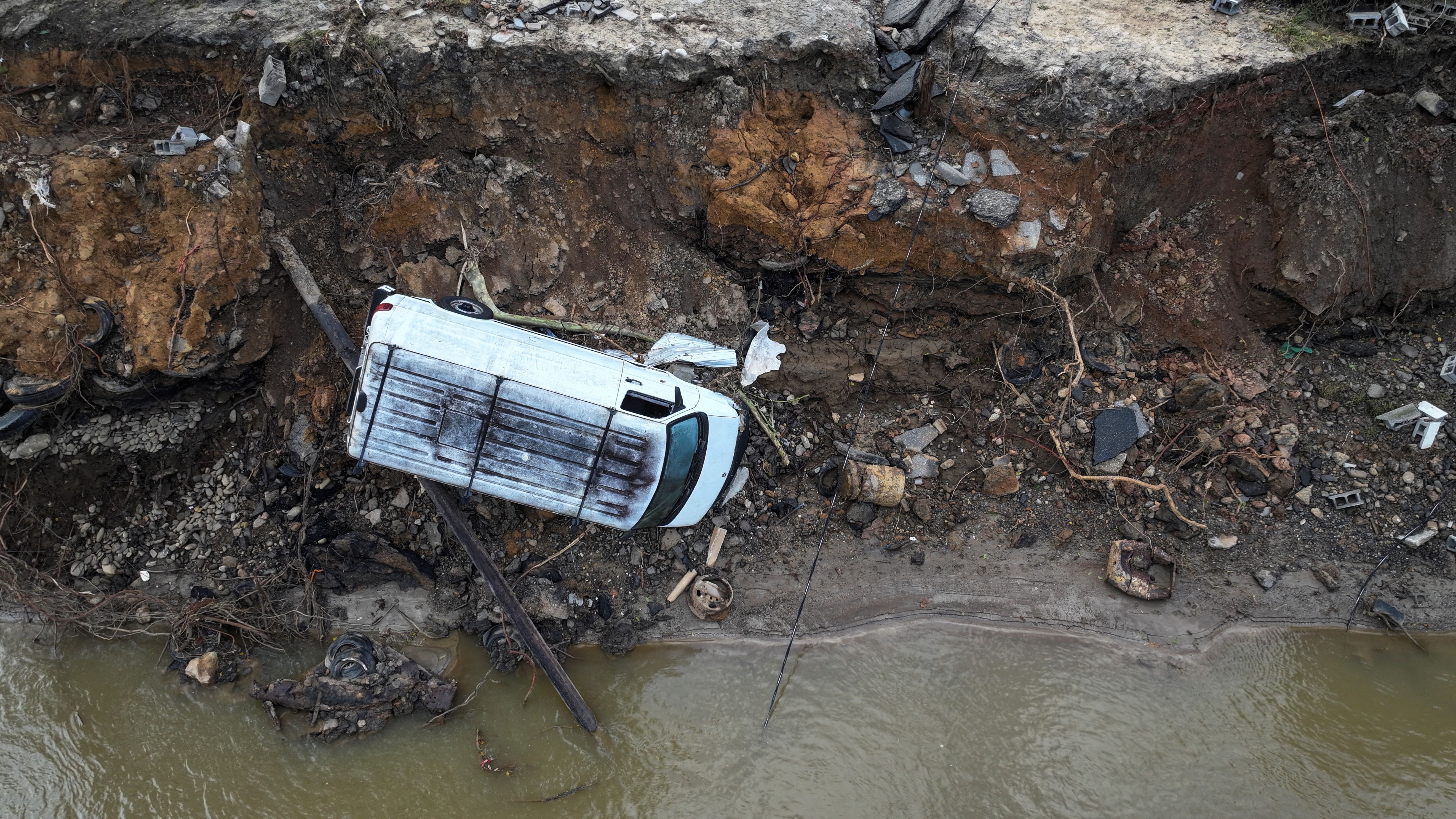 A drone view of a van toppled over on a crumbled embankment along the Swannanoa River after Storm Helene passed through the area, in Swannanoa, North Carolina on October 3, 2024. (Photo by Nathan Frandino/Reuters)