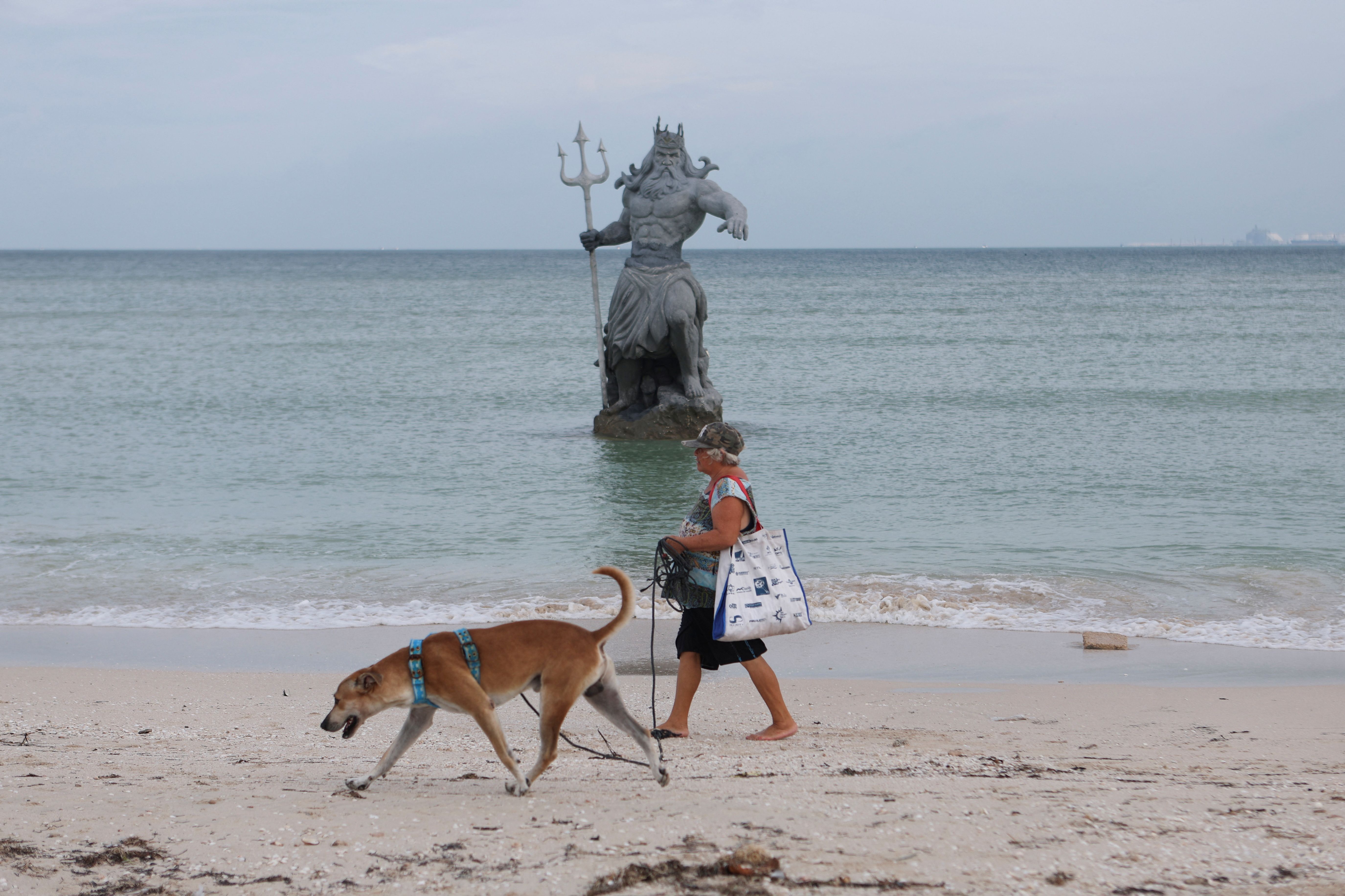 A woman walks past a statue of Poseidon as Hurricane Milton advances, in Progreso, Mexico, on October 7, 2024. (Photo by Lorenzo Hernandez/Reuters)