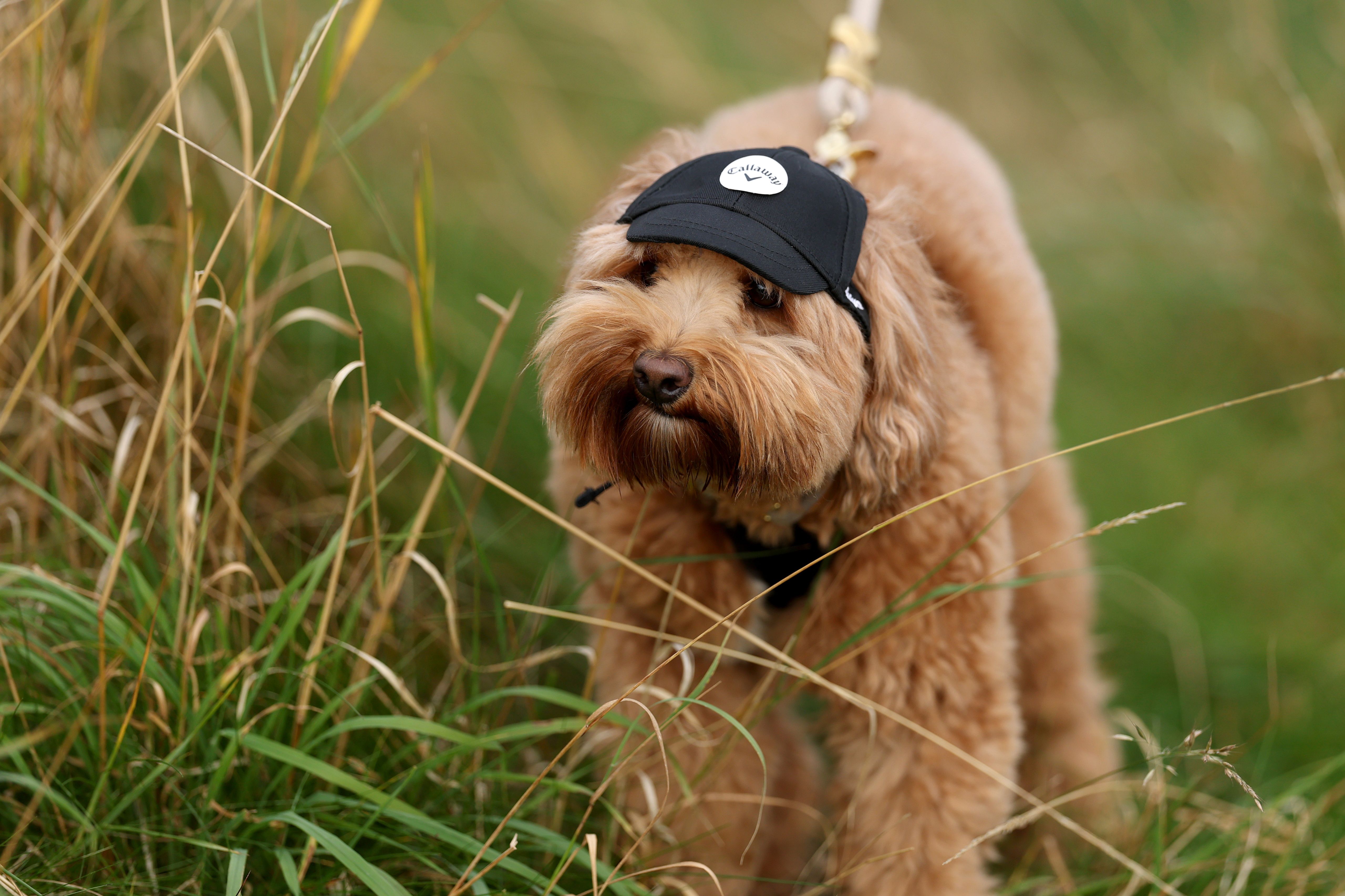 A dog wearing a Callaway cap looks across the course during day two of the Alfred Dunhill Links Championship 2024 at Carnoustie Golf Links on October 04, 2024 in Carnoustie, Scotland. (Photo by Richard Heathcote/Getty Images)