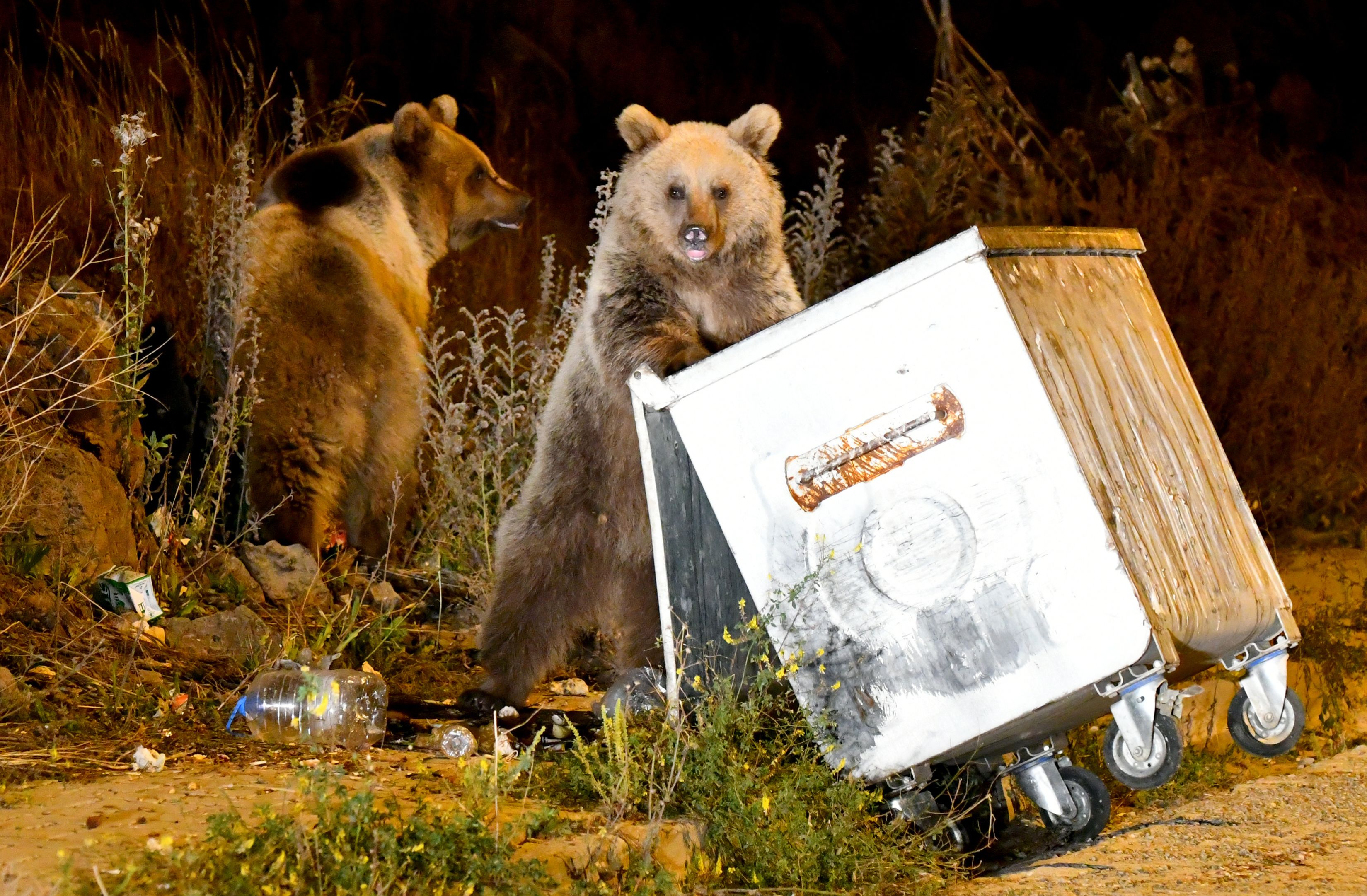 Brown bears look for food in garbage cans in the evening hours on September 27, 2024 in Sarikamis district of Kars, Turkiye. In the Sarikamis district, at an altitude of 2,150 meters, covered with Scots pine forests, where the world's only migratory brown bears live, the bears come down to the district from time to time to look for food. (Photo by Huseyin Demirci/Anadolu via Getty Images)