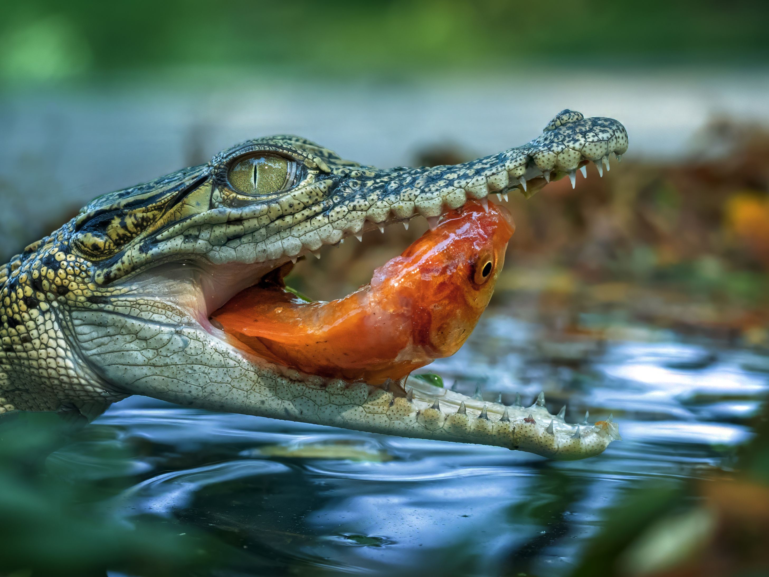 A freshwater crocodile snaps up his supper in Bekasi, Indonesia on October 9, 2024. The crocodiles can grow to ten feet in length. (Photo by Dzul Dzulfikri/Media Drum Images)
