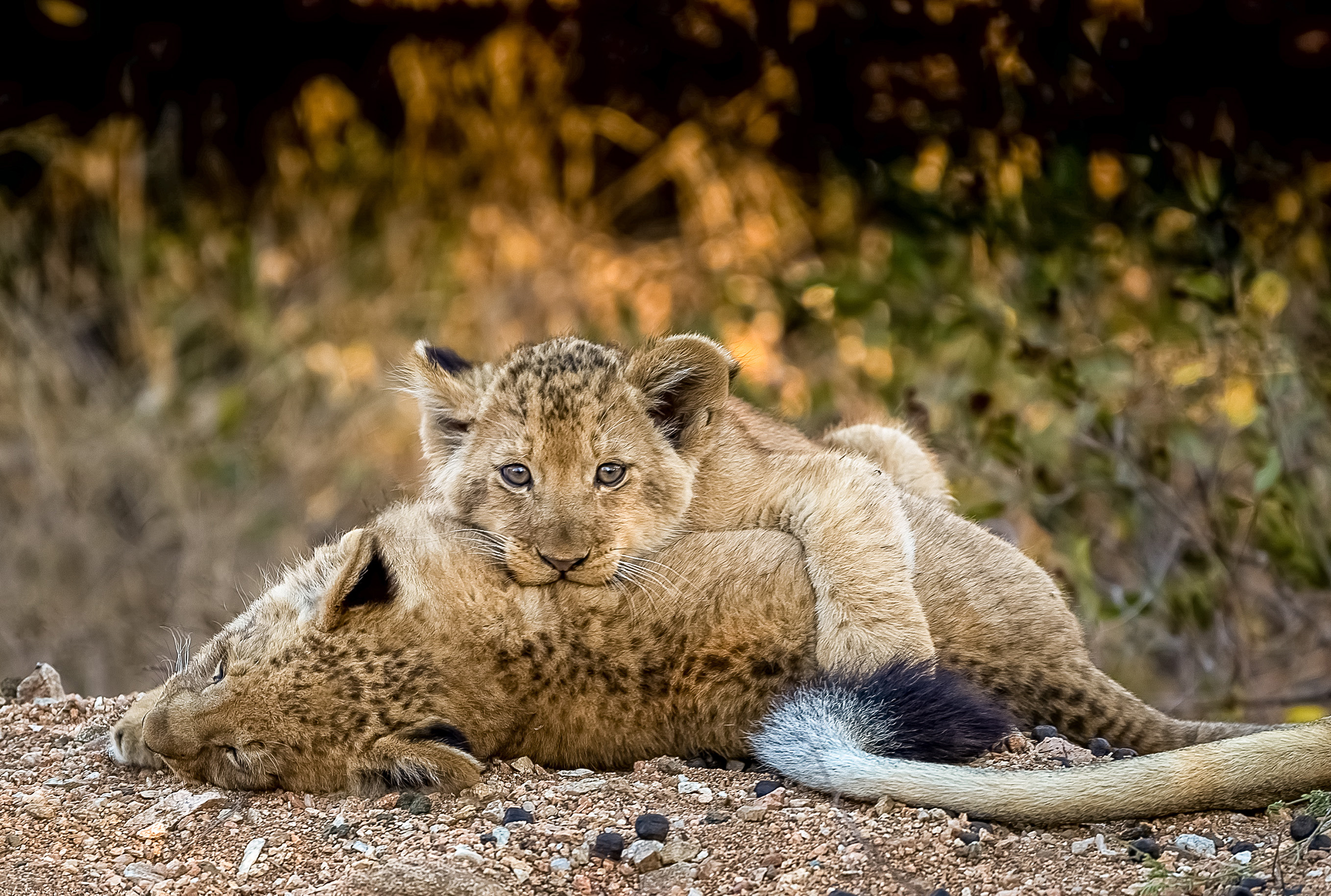A pair of three month-old lion cubs cuddle up in the Greater Kruger national park, South Africa early October 2024. (Photo by Charlie Lynam/Solent News)