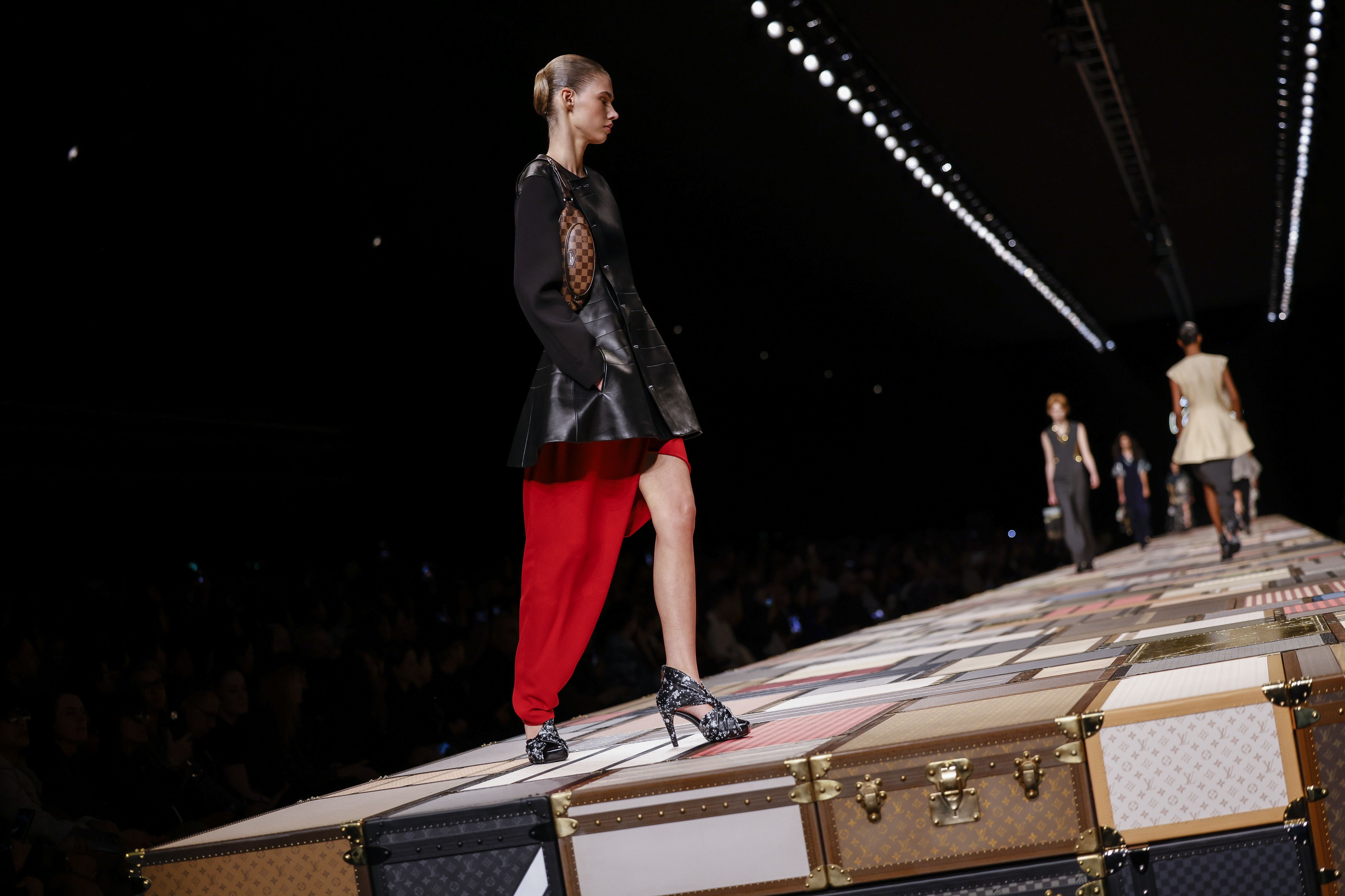A model wears a creation as part of the Louis Vuitton Spring/Summer 2025 collection presented Tuesday, October 1, 2024, in Paris. (Photo by Vianney Le Caer/Invision/AP Photo)