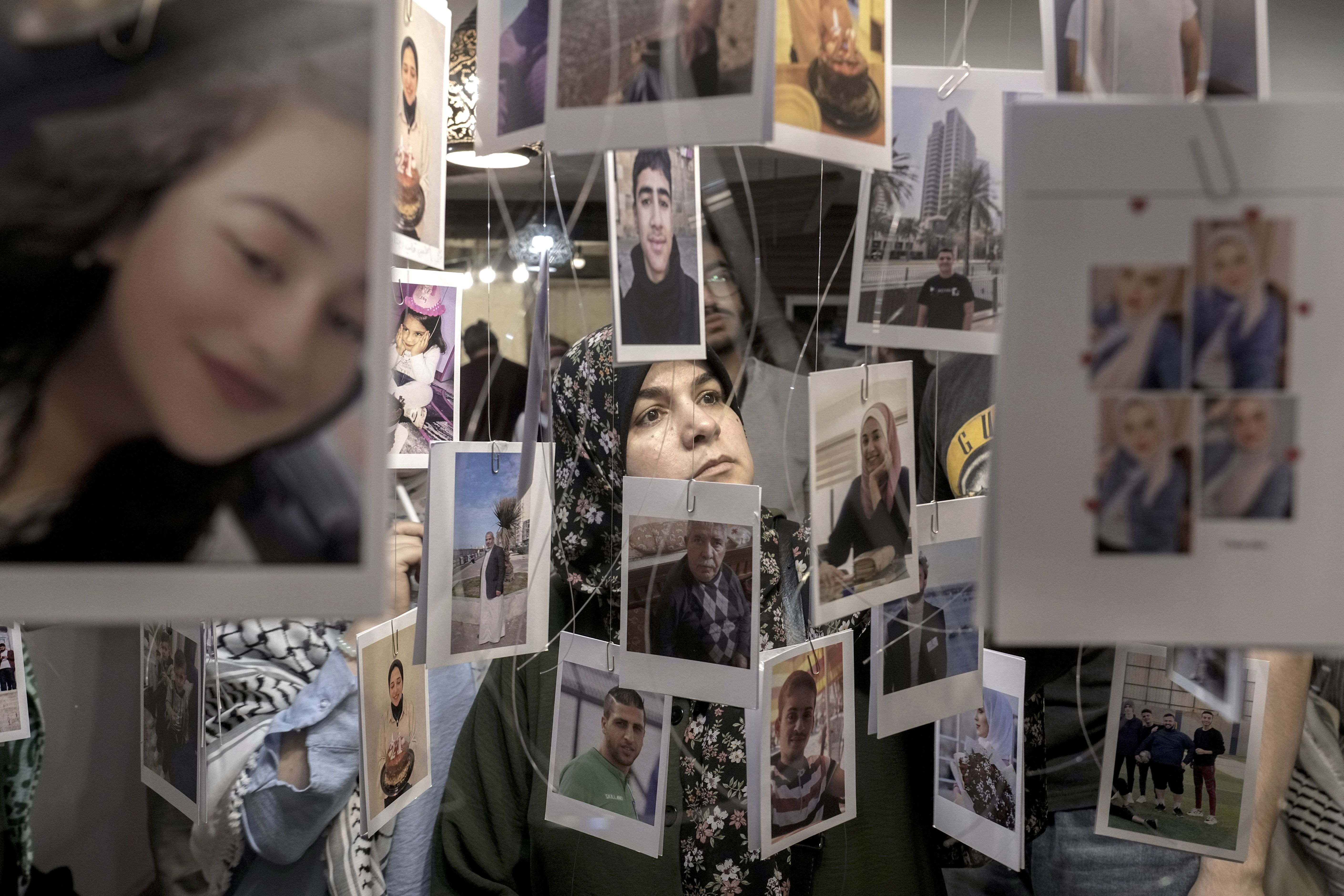 A woman views photos of Palestinian victims who were killed during the Israel war against Hamas, at a photo exhibition, (Gaza Habibti), Gaza my love, to commemorate the one-year anniversary of the war in the Gaza Strip, in Cairo, Egypt, Monday, October 7, 2024. (Photo by Amr Nabil/AP Photo)