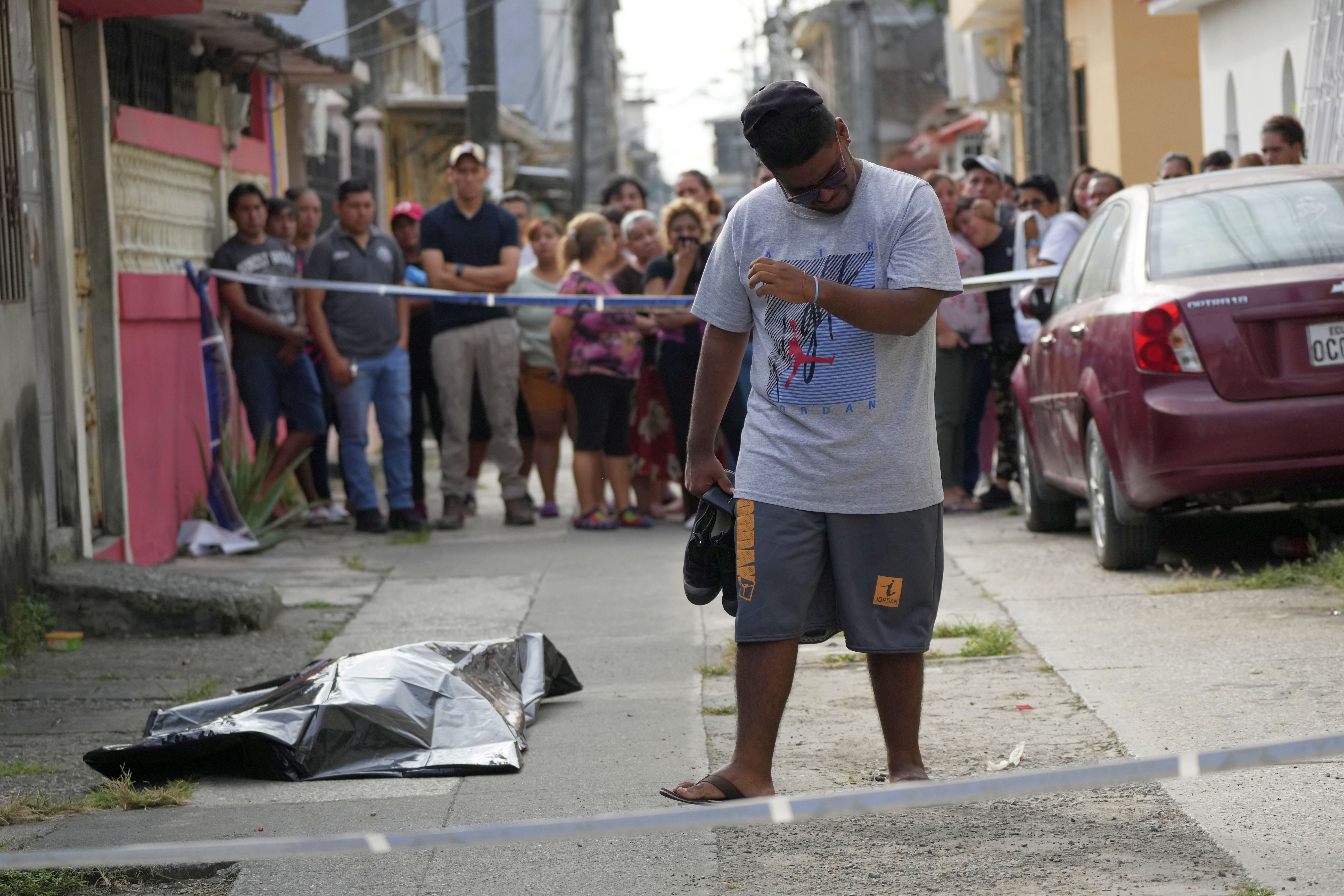 A person grieves near a covered body on the ground as residents watch from behind police tape in Duran, Ecuador, early Thursday, July 20, 2023. According to police, the body is that of a 20-year-old male who was shot to death. (Photo by Dolores Ochoa/AP Photo)