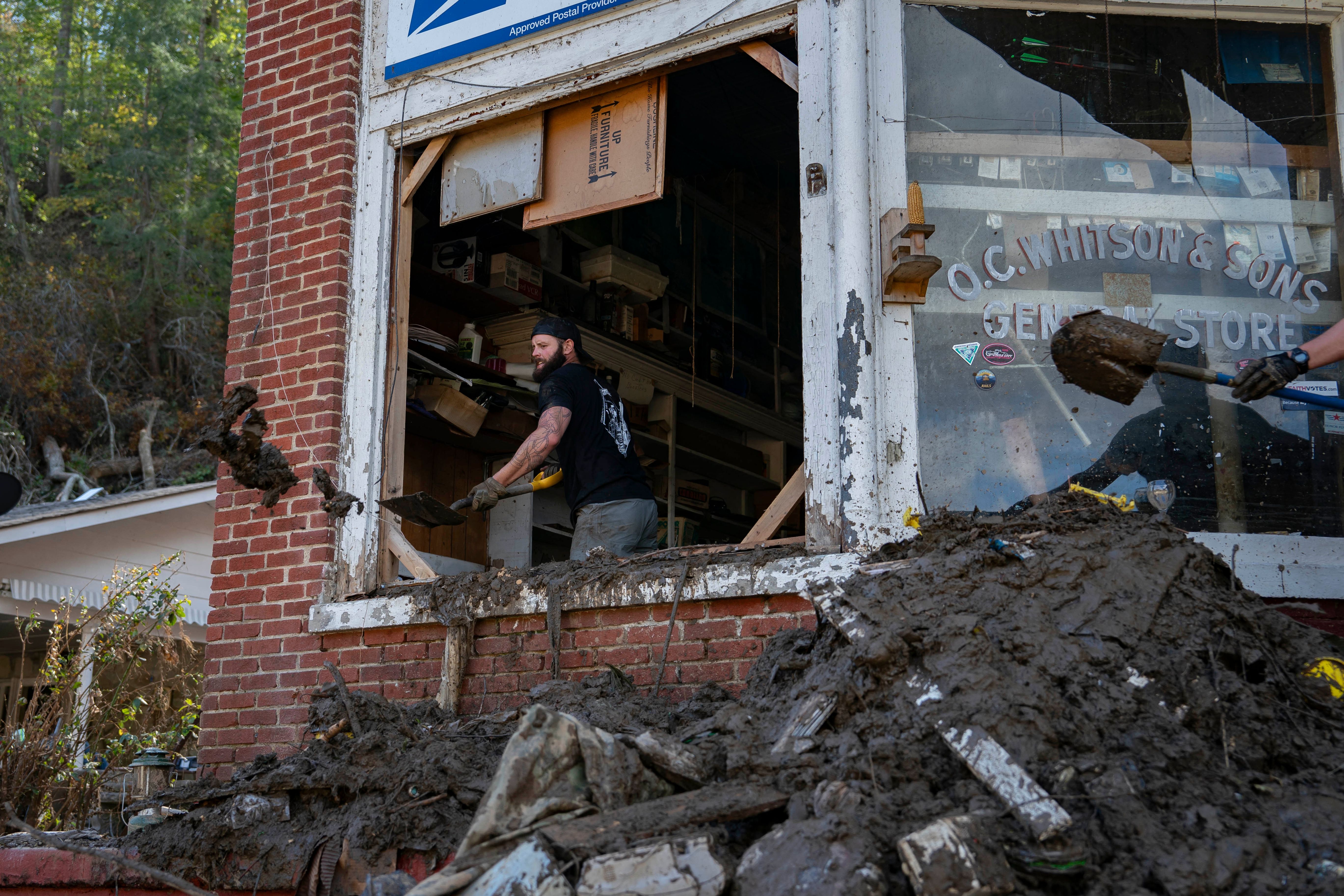 Volunteers with Operation Allies Refuge Foundation shovel debris and mud out of Whitson Furniture and General Store in Green Mountain, North Carolina, October 6, 2024, in the aftermath of Hurricane Helene. Whitson Furniture and General Store is 64 year old small family business The storm, which struck Florida on September 26, has killed more than 225 people across a handful of states – making it the deadliest natural disaster to hit the United States since 2005's Hurricane Katrina – with the toll still rising. (Photo by Allison Joyce/AFP Photo)