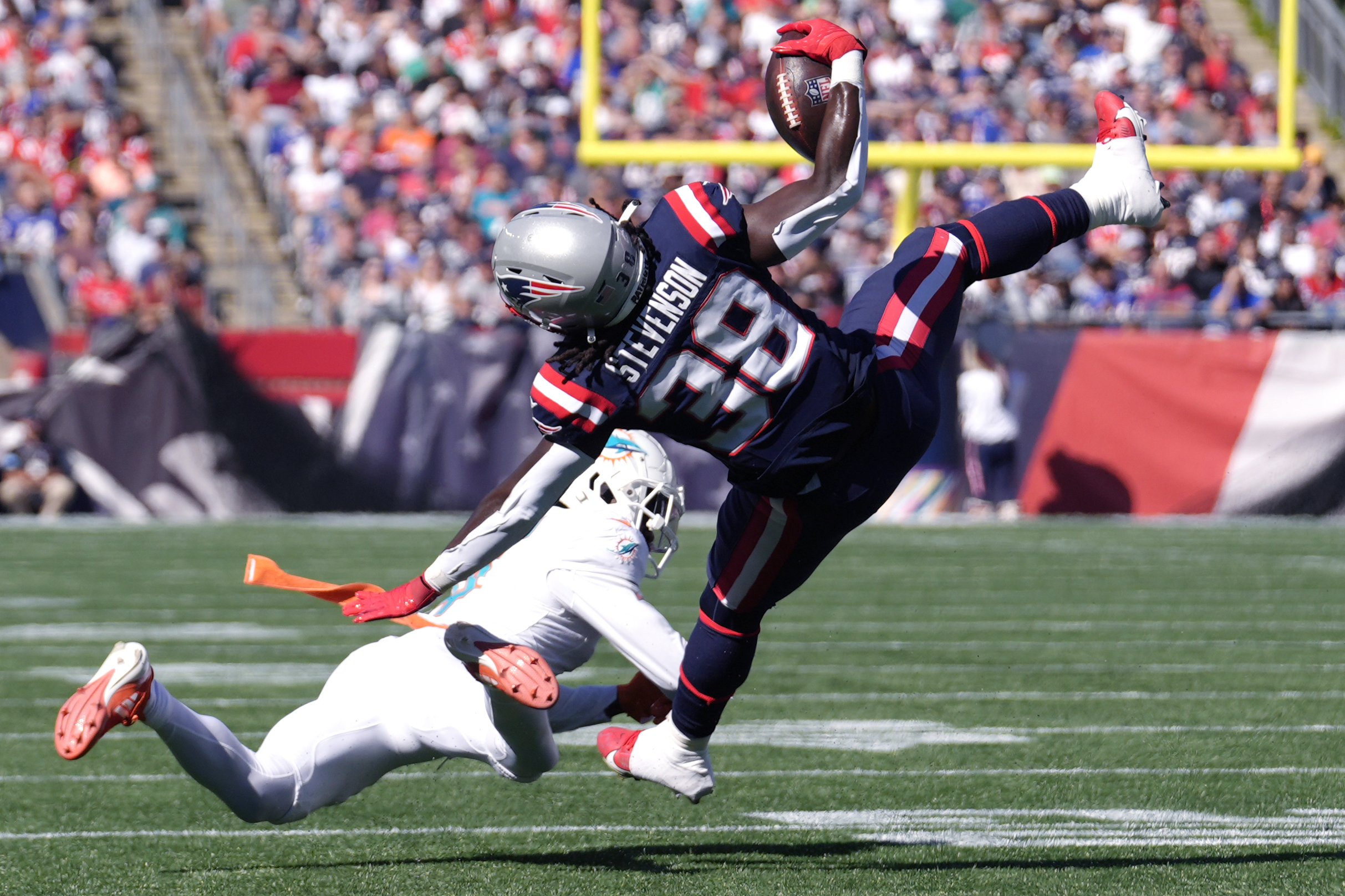 New England Patriots running back Rhamondre Stevenson (38/AP hangs onto the ball after colliding with Miami Dolphins cornerback Kader Kohou (4/AP during the first half of an NFL football game, Sunday, October 6, 2024, in Foxborough, Mass. (Photo by Steven Senne/AP Photo)