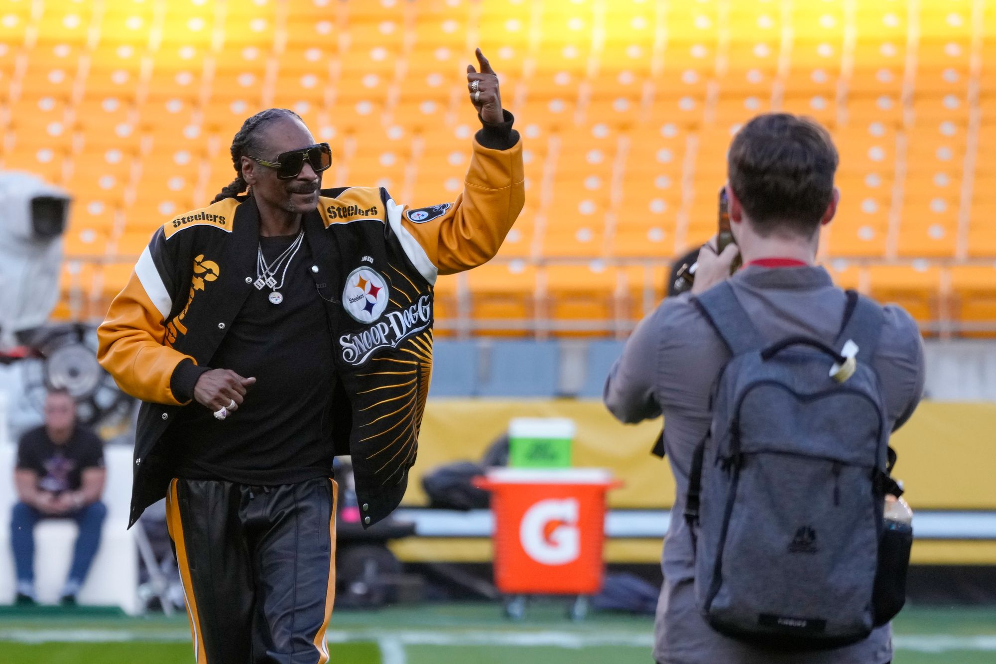 Rapper Snoop Dogg poses for photos prior to an NFL football game between the Pittsburgh Steelers and the Dallas Cowboys, Sunday, October 6, 2024, in Pittsburgh. (Photo by Gene J. Puskar/AP Photo)