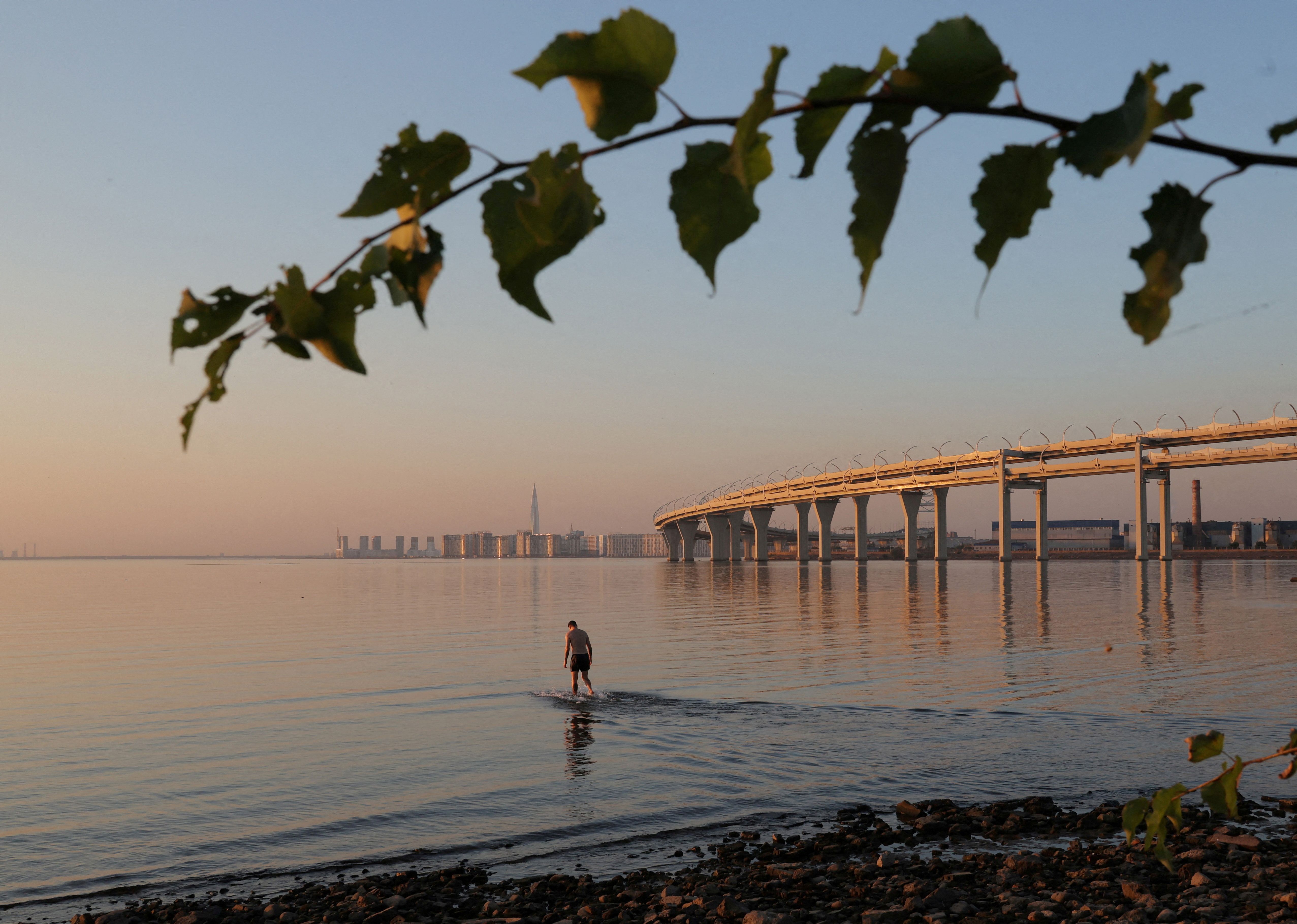 A man wades in the Gulf of Finland near the Western High-Speed Diameter (WHSD) highway during sunset in Saint Petersburg, Russia on September 8, 2024. (Photo by Anton Vaganov/Reuters)