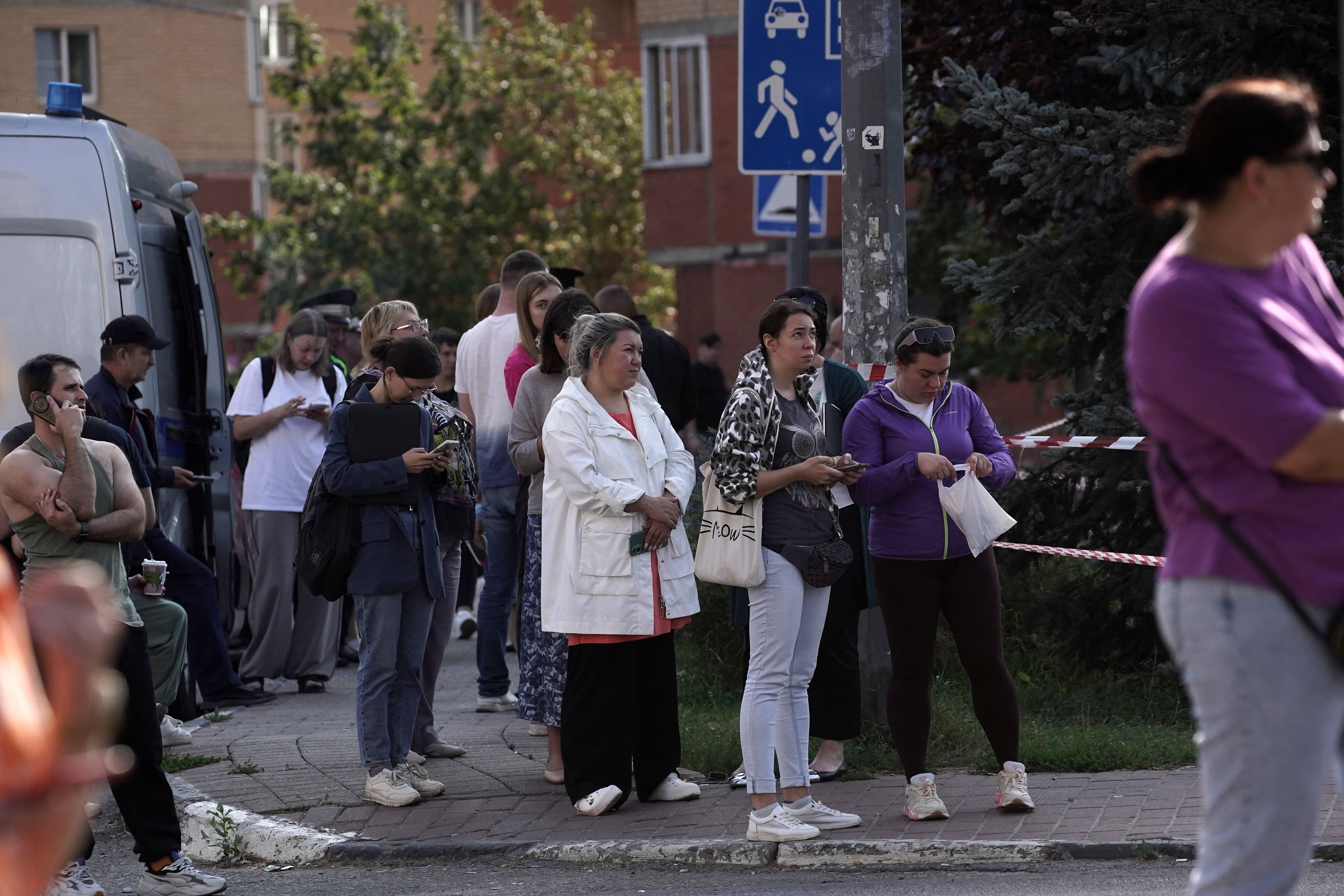 People gather outside of a damaged residential building following a drone attack in Ramenskoye in the Moscow region on September 10, 2024. A massive wave of Ukrainian drones set off air defences across several Russian regions, officials said on September 10, 2024, killing at least one person and grounding flights in the capital. (Photo by Tatyana Makeyeva/AFP Photo)