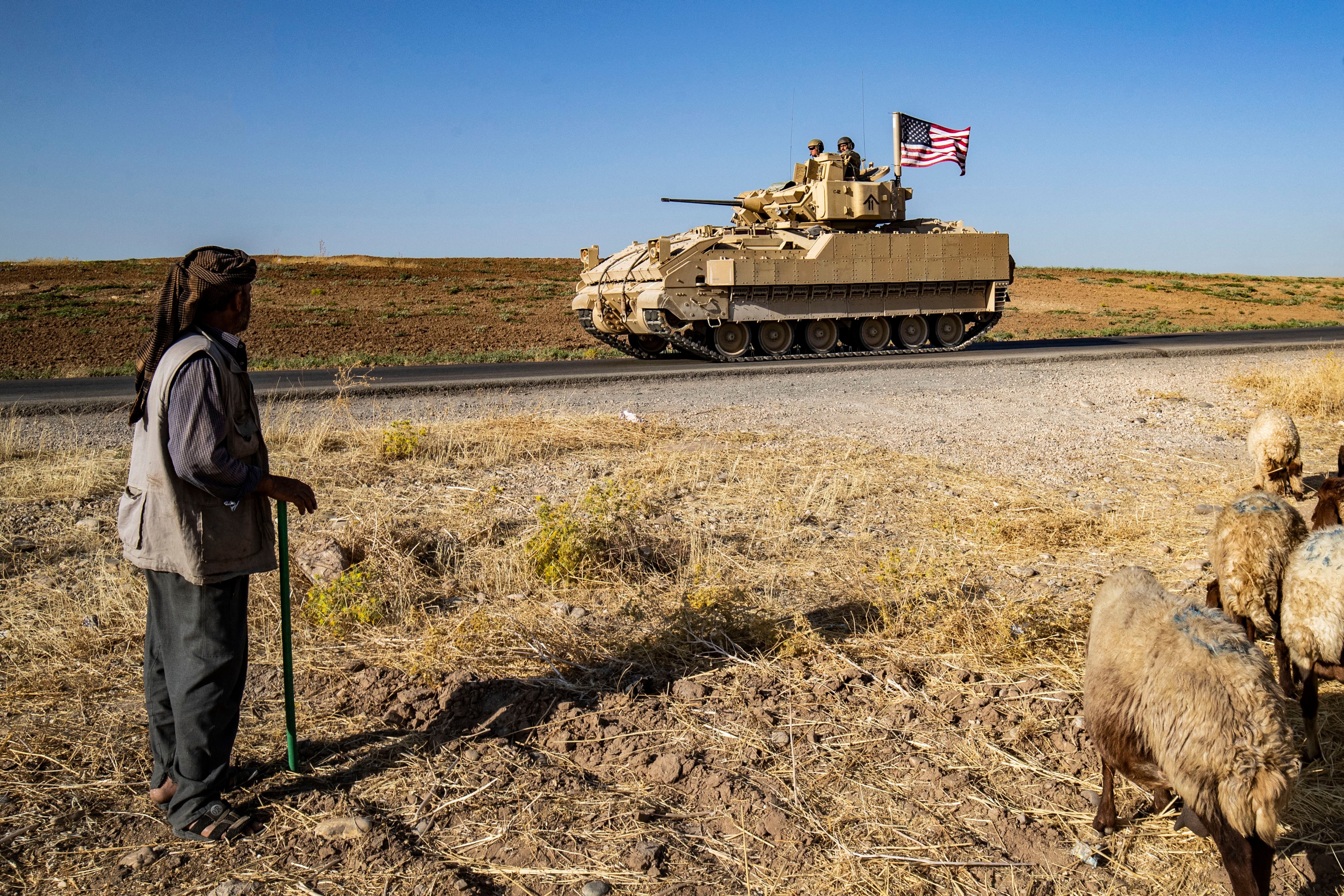 US soldiers in a Bradley Fighting Vehicle (BFV) patrol the countryside of al-Malikiya town (Derik in Kurdish) in Syria's northeastern Hasakah province July 17, 2023. (Photo by Delil Souleiman/AFP Photo)