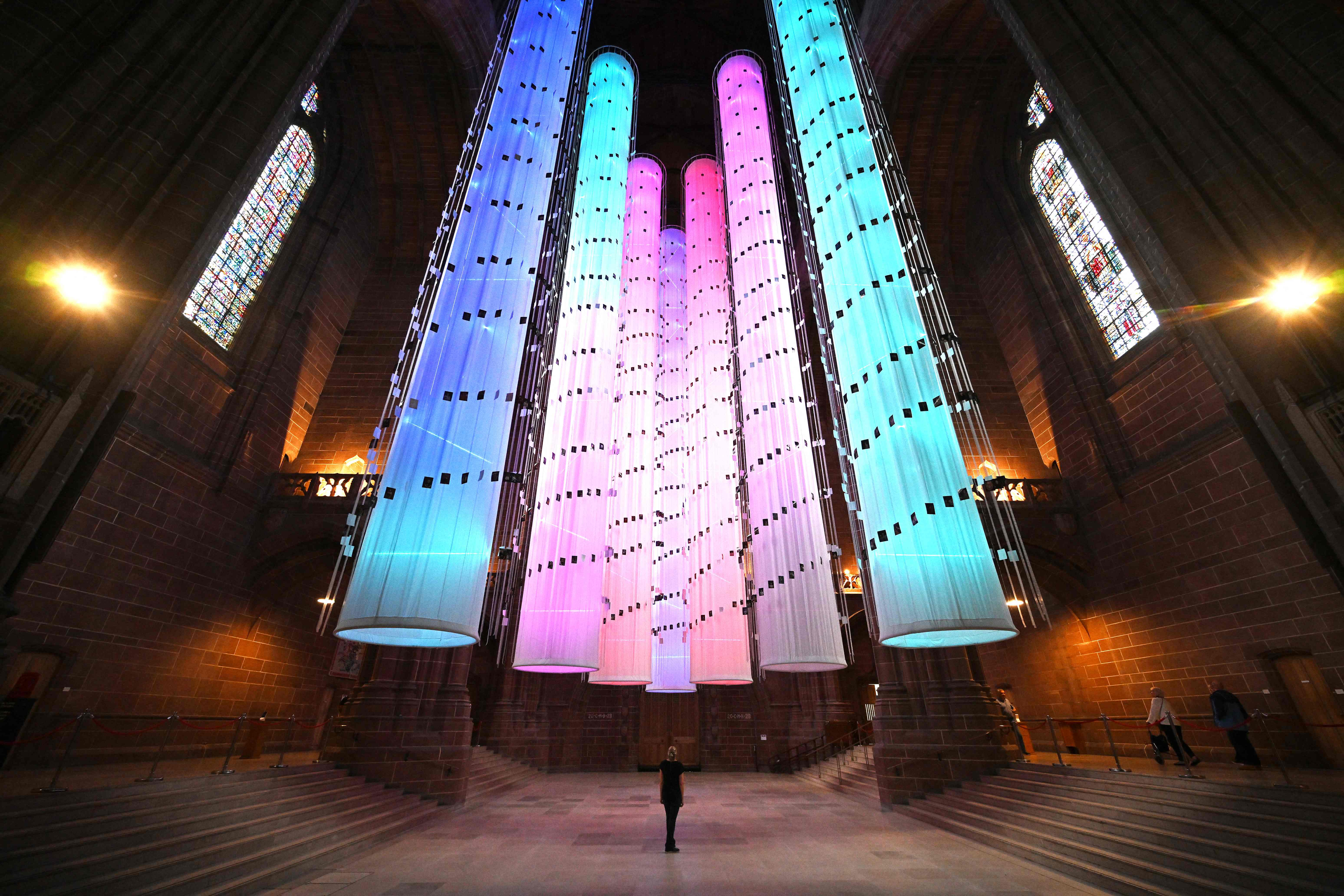 An artwork, “Identity” by sculptor Peter Walker is seen as it is installed in Liverpool Cathedral on July 27, 2023 in Liverpool, north west England. The final chapter of the Identity – we are all together series, following the success of “Peace Doves” and 'Being Human' will be on display until September 3. The seven illuminated columns are lit with individual strips of light representing the double helix of DNA and demonstrating the unique make up of each person. The columns are wrapped in more than 3000 individual portraits potographed as part of Peter Walker's 2022 installation “Being Human”. (Photo by Paul Ellis/AFP Photo)