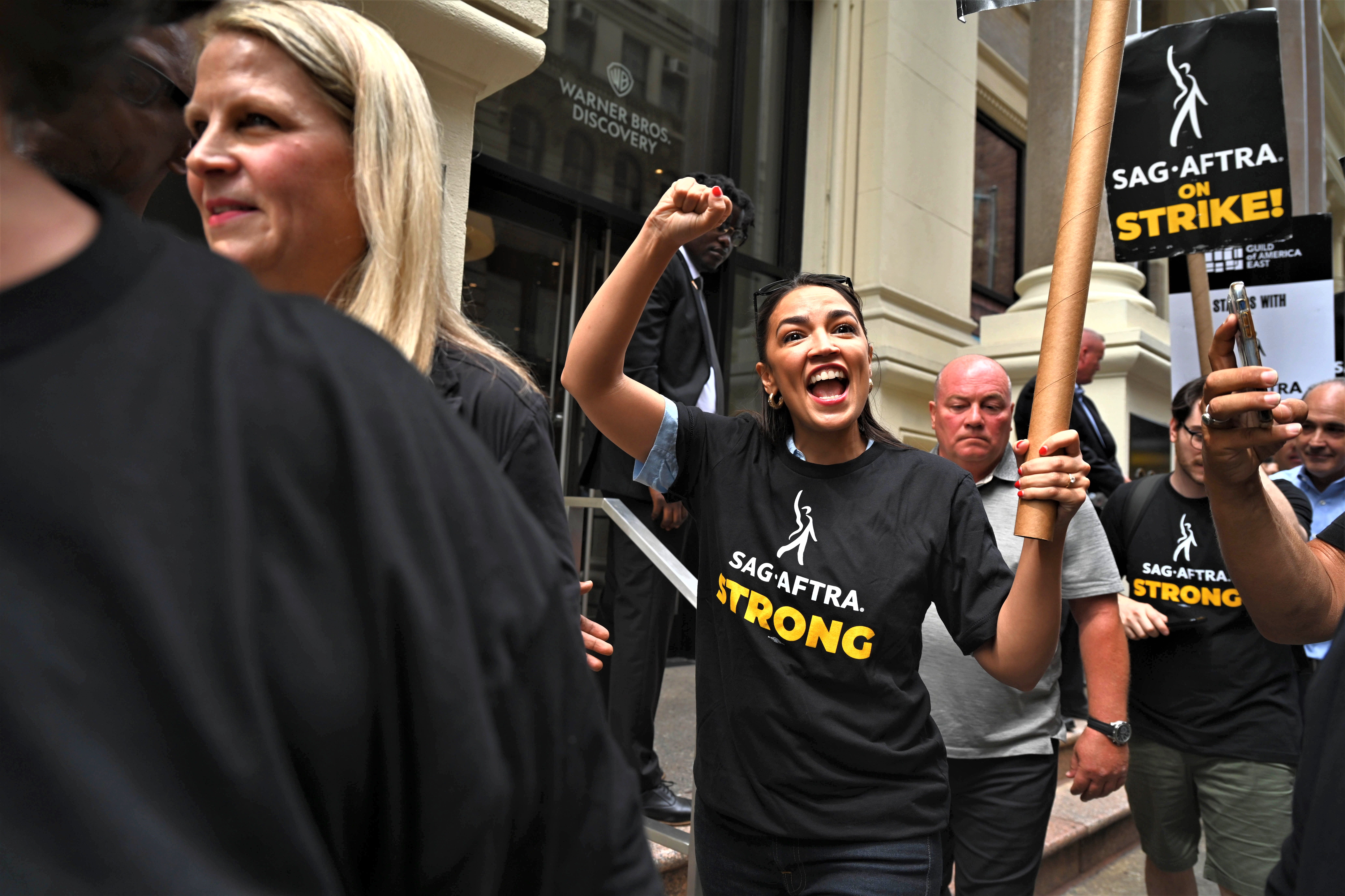 American politician and activist Alexandria Ocasio-Cortez walks the picket line in support of the Sag-Aftra and WGA strike in New York, US on July 24, 2023. (Photo by NDZ/Star Max/GC Images)