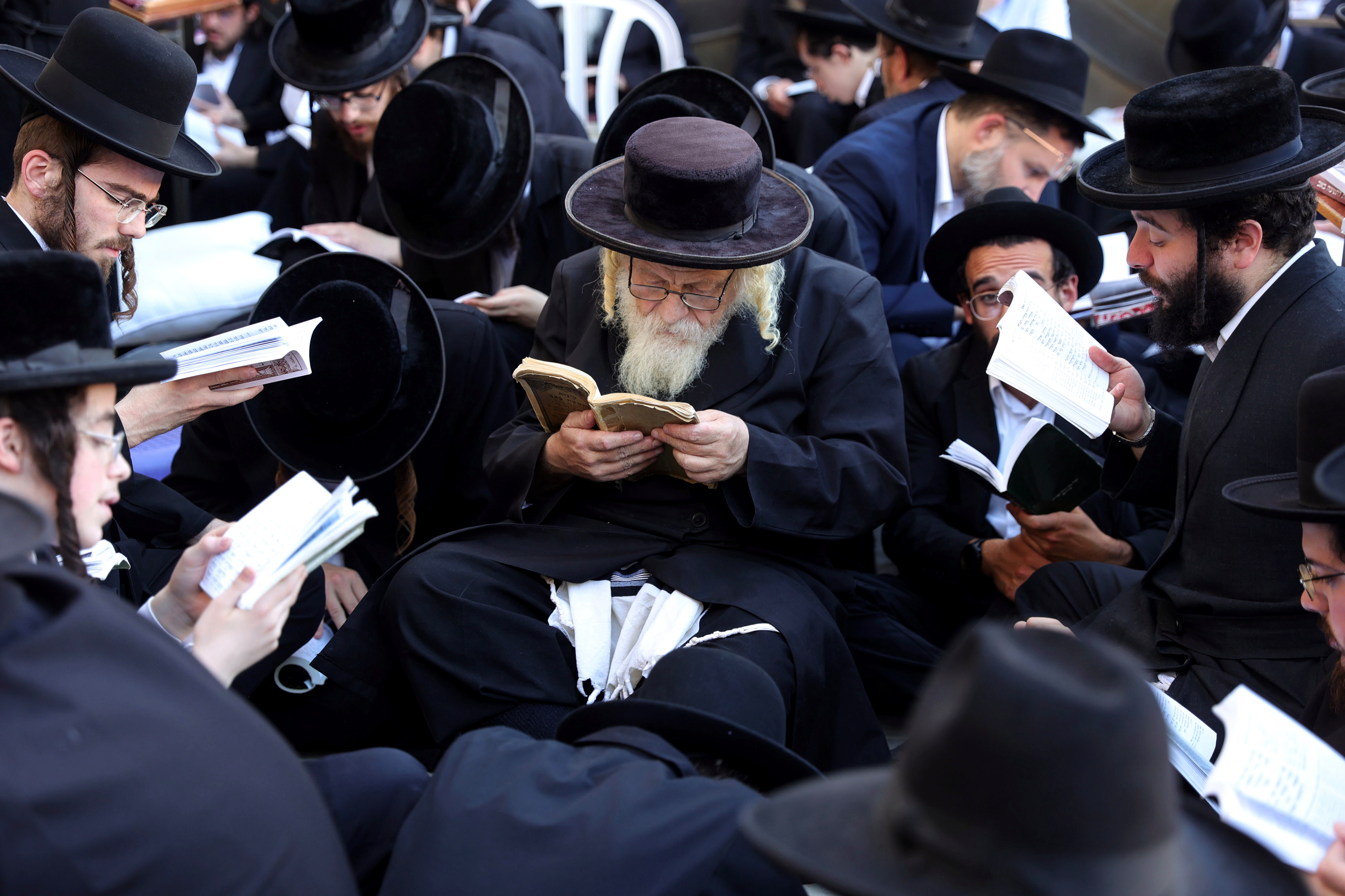 Orthodox Jews pray as they read from the book of Eicha (Book of Lamentations) to mark Tisha B'av, at The Western Wall, in the Old City of Jerusalem on July 27, 2023. In Judaism, the Tisha B'Av is an annual fast day to mark the destruction of the first and the second temple by the Babylonian and the Roman Empires in Jerusalem. During Tisha B'av, Ultra-Orthodox Jews stay up all night and sleep at the Western Wall as they recite lamentations focusing on the destruction of the ancient temple, that was located on the other side of the ancient wall, on the Temple Mount. (Photo by Abir Sultan/EPA/EFE)