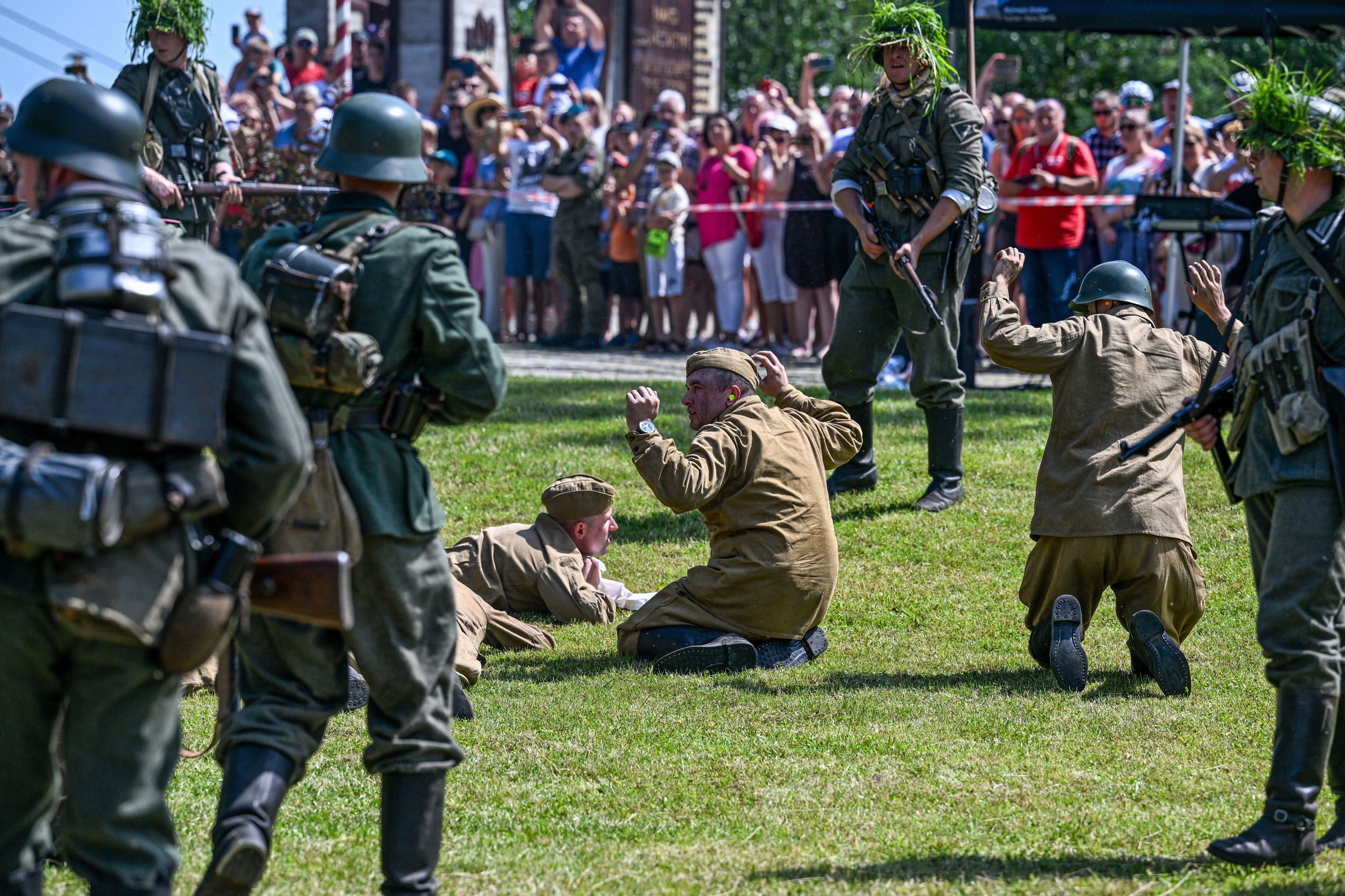 Members of a historical military club perform in a reenactment of a battle between German and Soviet soldiers, in Przemysl, southeastern Poland, 23 July 2023. The original battle was fought in 1941 for a bunker along the San River in World War II; the reenactment was shown to the visitors of the 2nd History Connects Us Festival in Przemysl. (Photo by Darek Delmanowicz/EPA)
