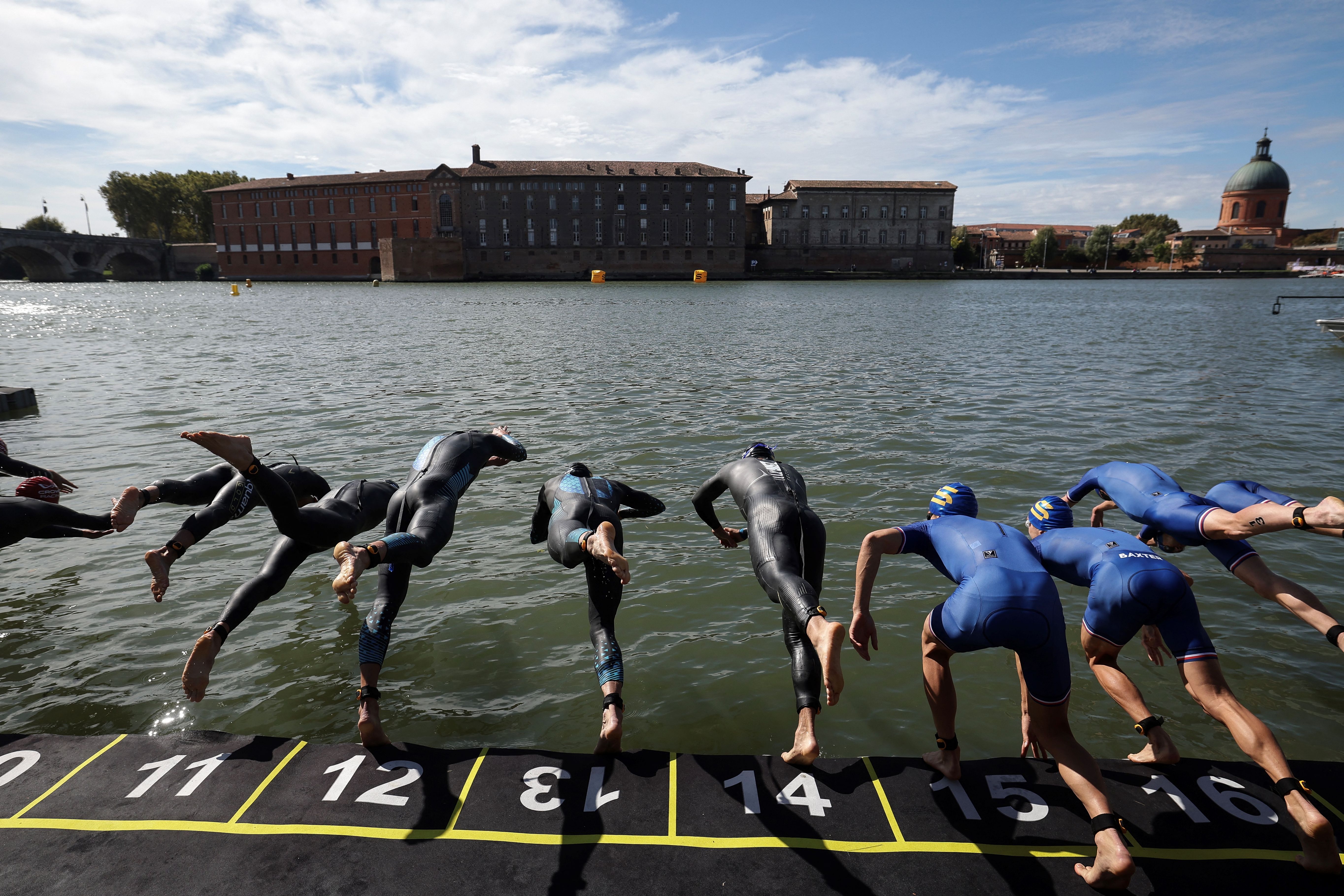 Triathletes dive into the Garonne river as they compete in the men's Supertri triathlon in Toulouse, south-western France, on October 6, 2024. (Photo by Valentine Chapuis/AFP Photo)