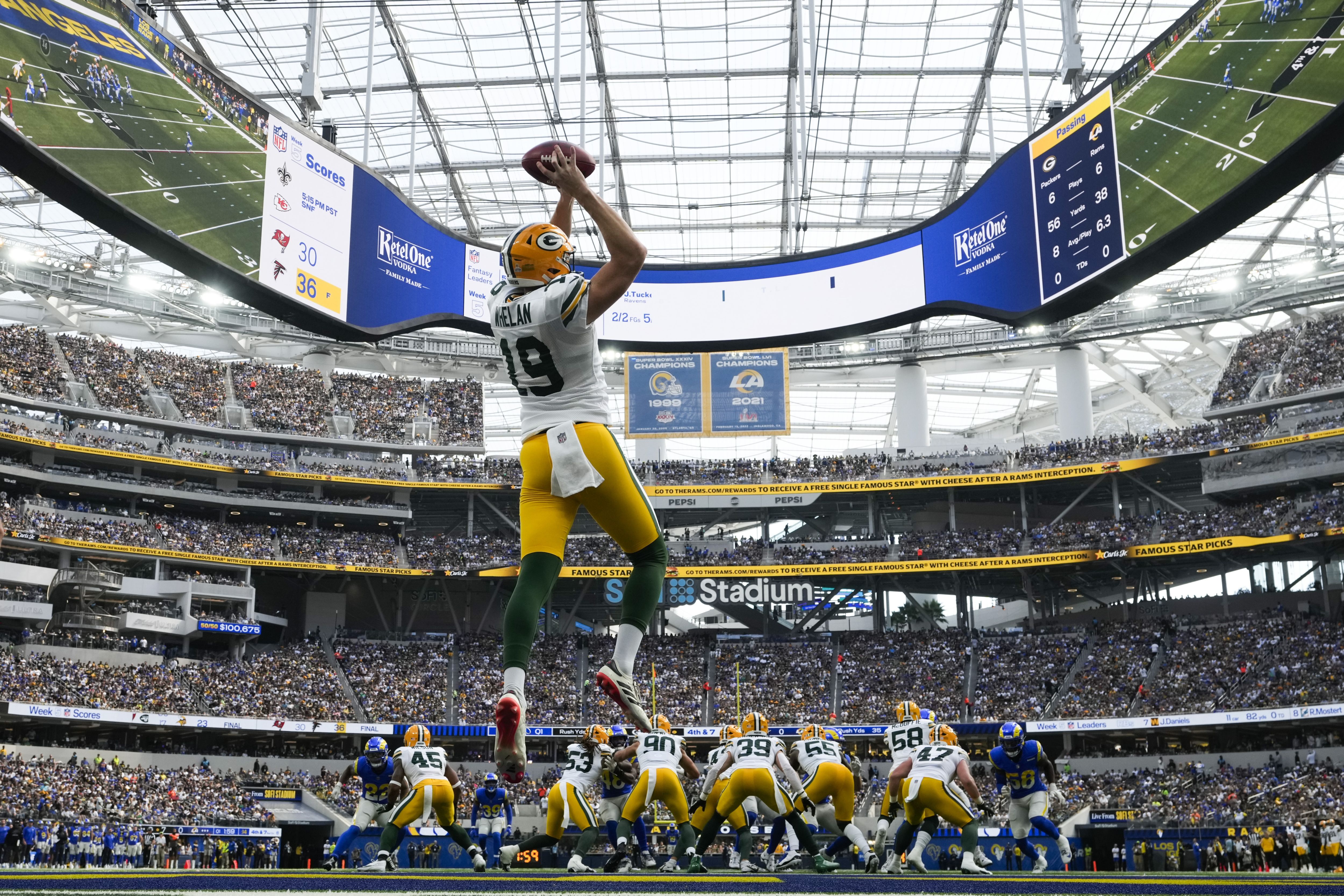 Green Bay Packers punter Daniel Whelan (19) grabs a high snap during the first half of an NFL football game against the Los Angeles Rams, Sunday, October 6, 2024, in Inglewood, Calif. (Photo by Gregory Bull/AP Photo)
