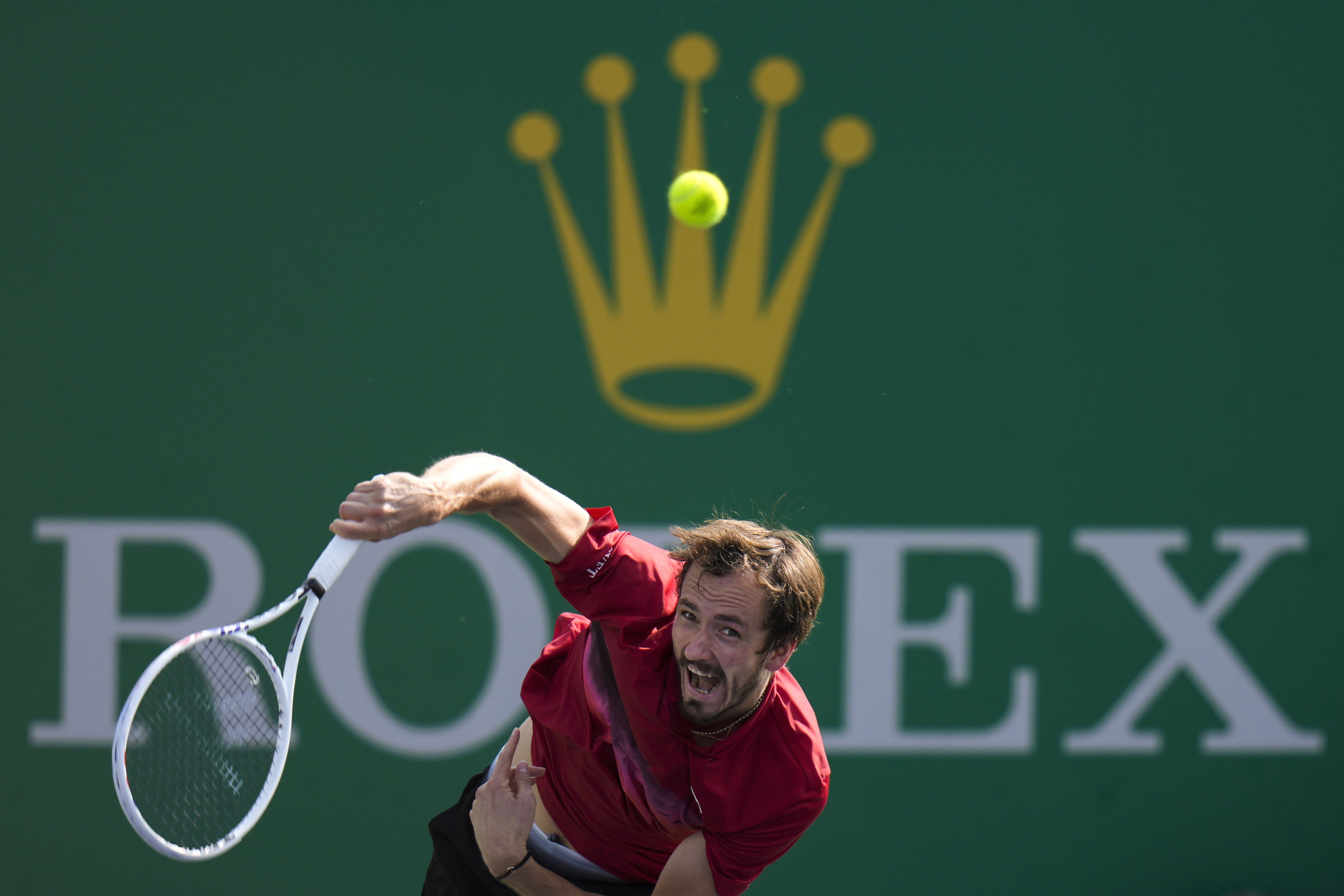 Daniil Medvedev of Russia serves against Stefanos Tsitsipas of Greece during the men's singles fourth round match in the Shanghai Masters tennis tournament at Qizhong Forest Sports City Tennis Center in Shanghai, China, Wednesday, October 9, 2024. (Photo by Andy Wong/AP Photo)