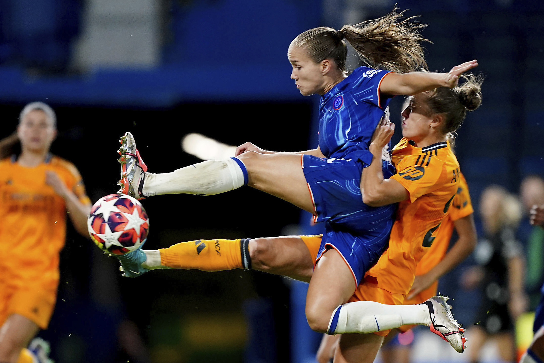 Chelsea's Guro Reiten, front, has a shot on goal during the women's Champions League group B soccer match between FC Chelsea and Real Madrid in London, England, Tuesday, October 8, 2024. (Photo by Zac Goodwin/PA Wire via AP Photo)