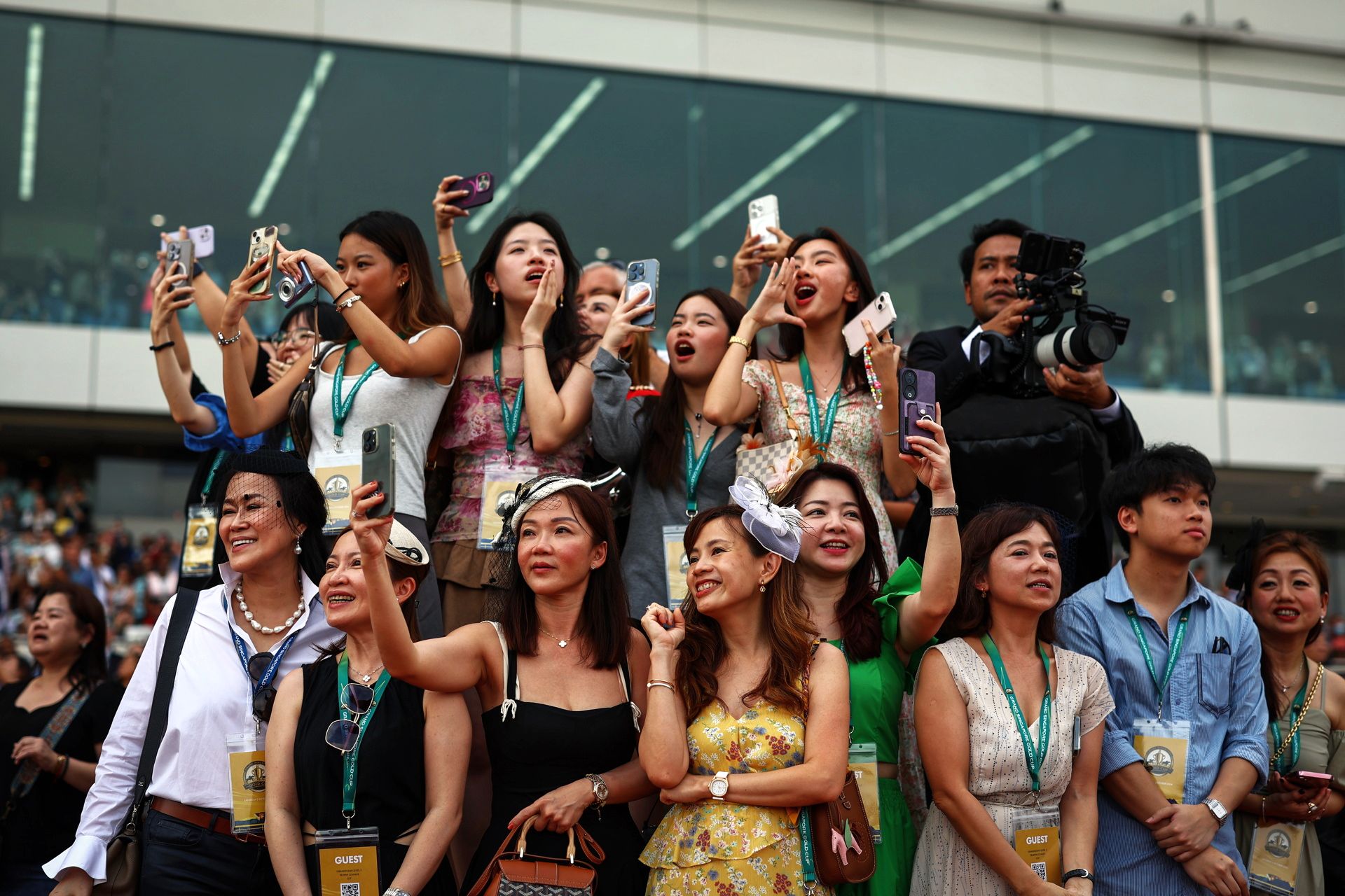 Guests react as they gather trackside to watch the final race of the Singapore Turf Club in Kranji, Singapore on October 5, 2024. (Photo by Edgar Su/Reuters)