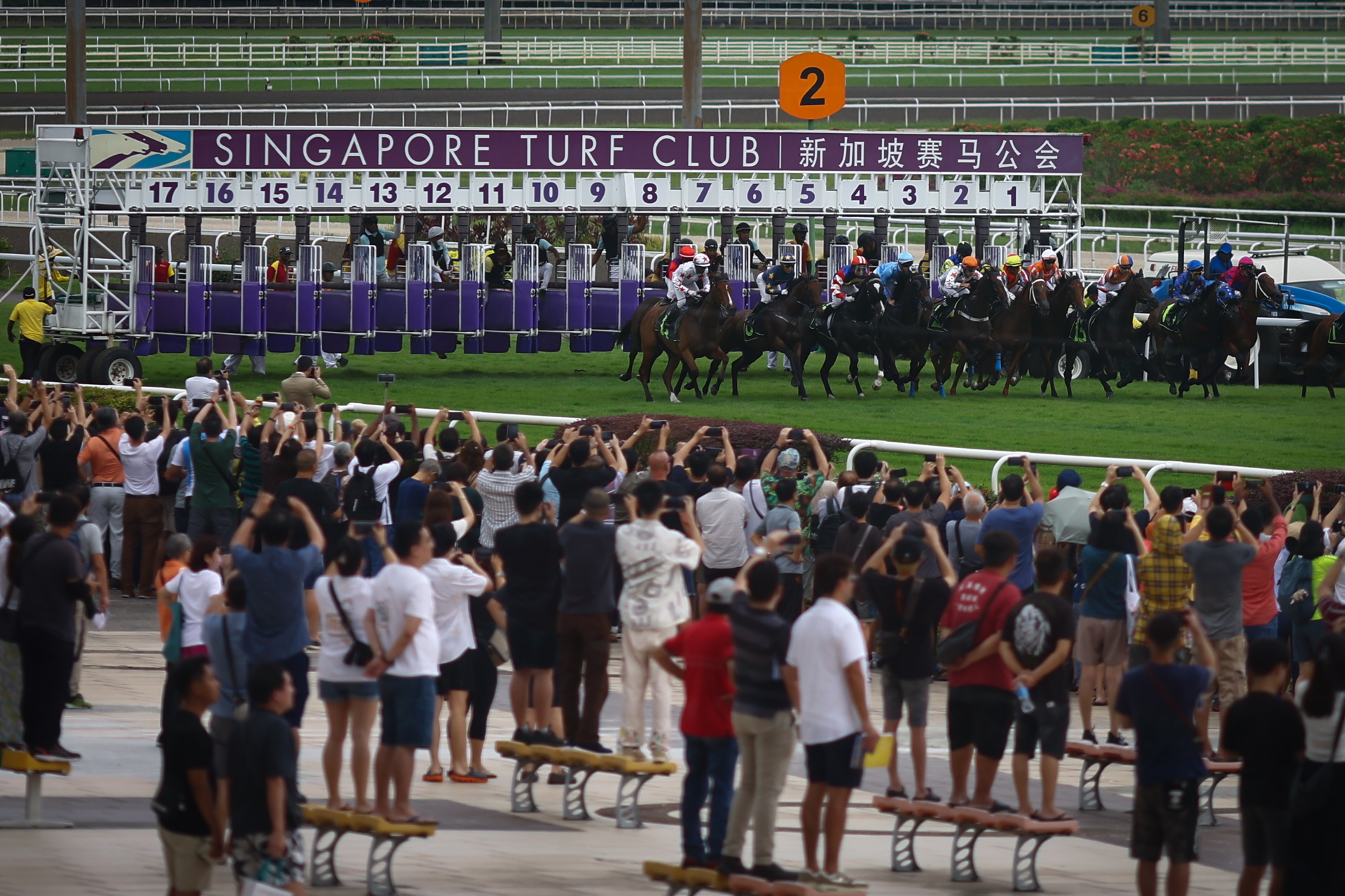 Spectators watch as horses sprint from their starting boxes during a race on the final race day of the Singapore Turf Club in Kranji, Singapore on October 5, 2024. (Photo by Edgar Su/Reuters)