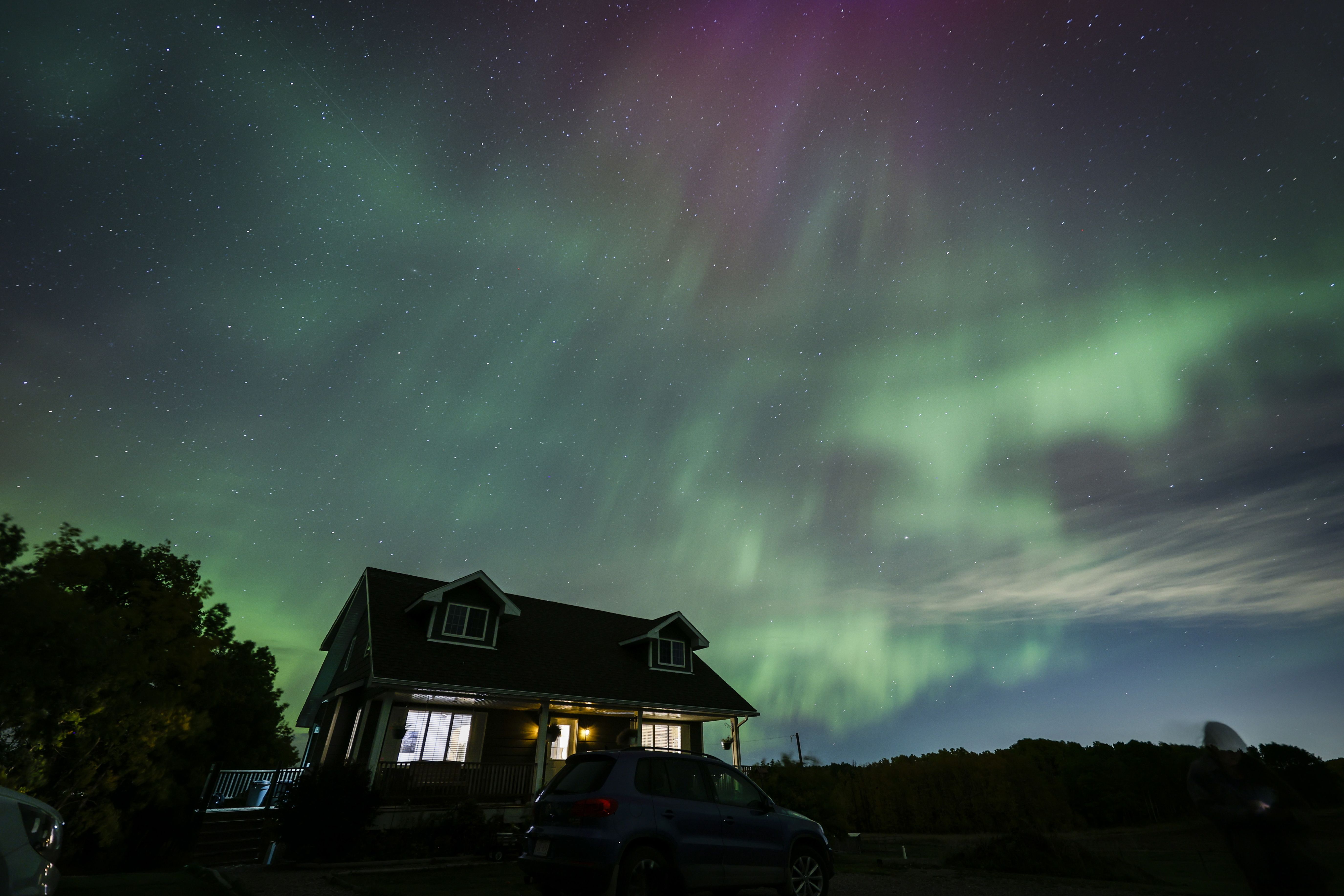 An aurora borealis, also known as the northern lights, is seen over a home near Cremona, Alberta, Monday, October 7, 2024. (Photo by Jeff McIntosh/The Canadian Press via AP Photo)