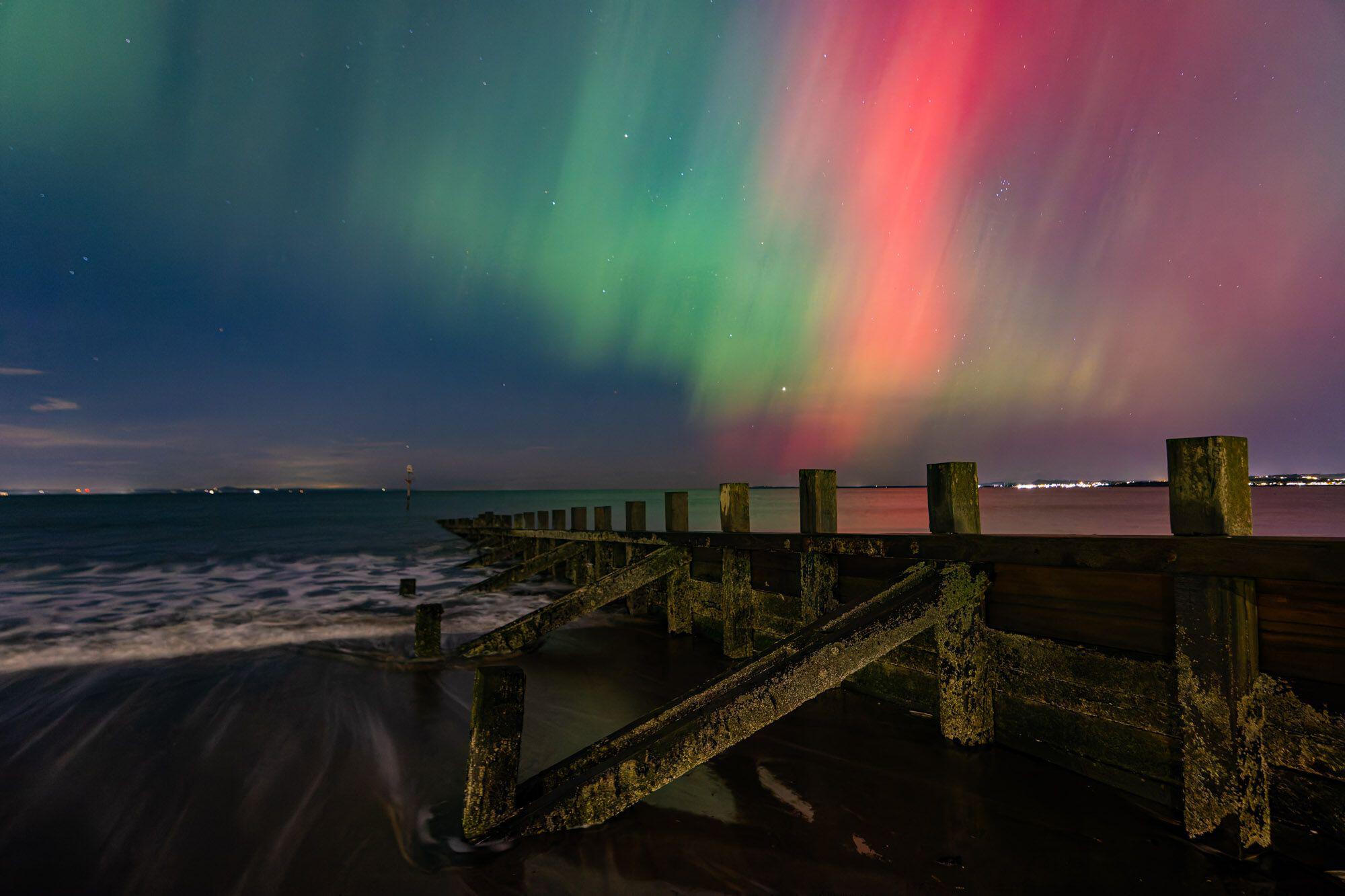 The Northern Lights visible over a groyne on the beach at Portobello near Edinburgh, United Kingdom on October 10, 2024. The Aurora Borealis (or Northern Lights) was visible over much of the United Kingdom. (Photo by Rich Dyson/Alamy Live News)