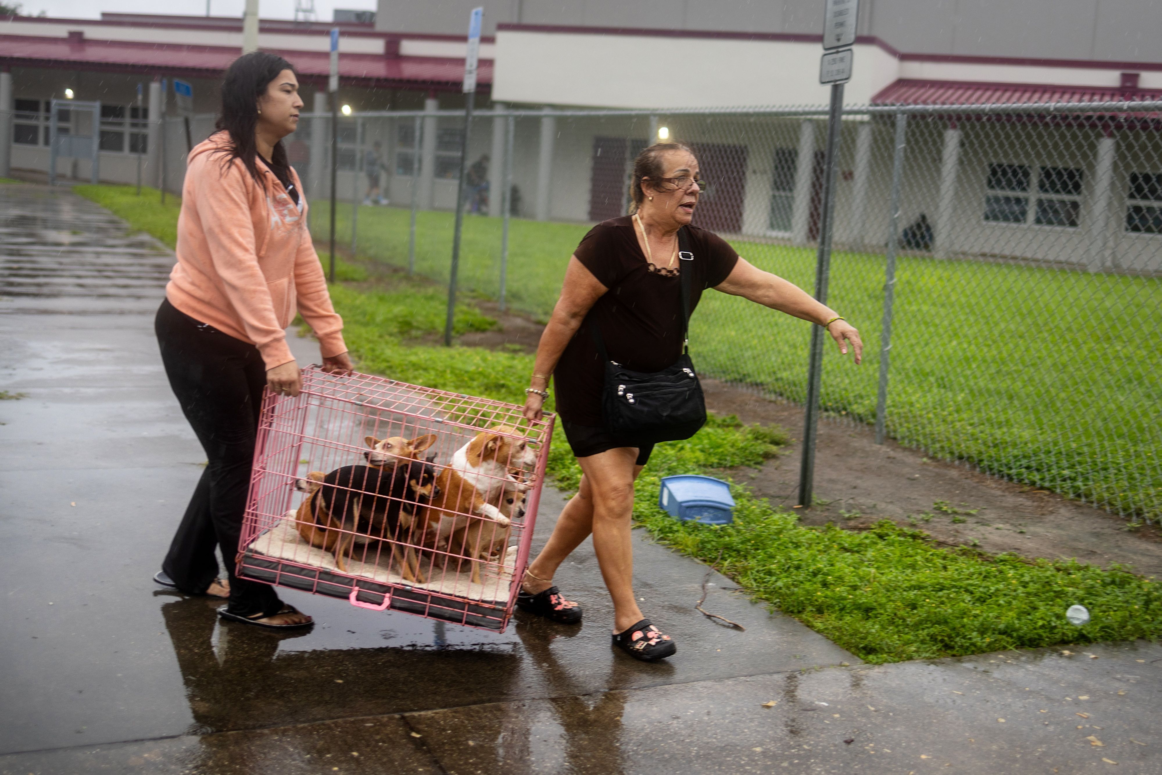 Jeny Gomez, left, and her mother, Paula Cosa, carry a crate with dogs into Middleton High School, which is open as a shelter in Tampa on Wednesday, October 9, 2024. (Photo by Kathleen Flynn for The Washington Post)