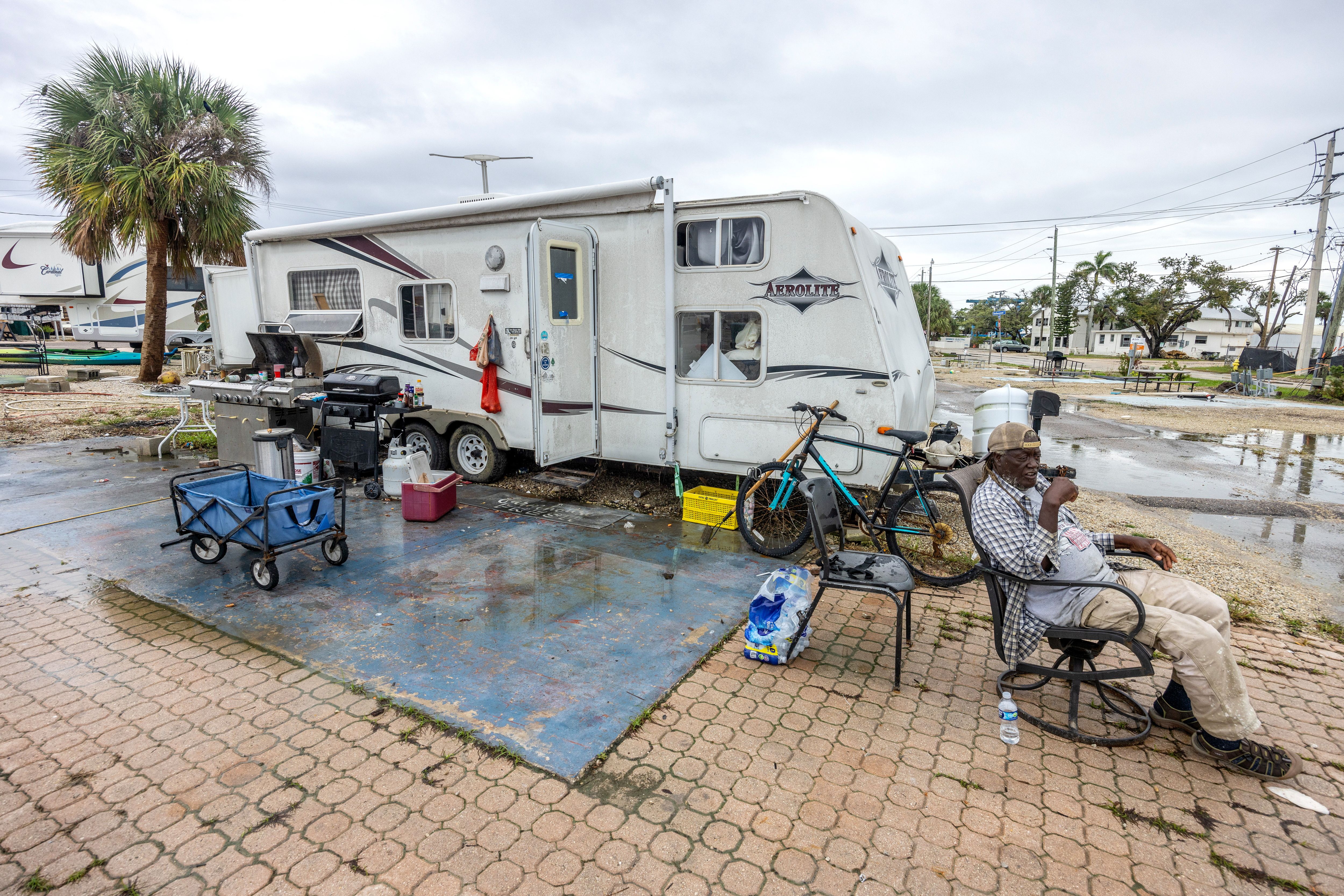 “Smoky” (79), waits for a truck to help him move his mobile home to a safer place in San Carlos Island, Fort Myers beach, as the city prepares for Hurricane Milton in Bonita Beach, Florida, USA, 08 October 2024. According to the National Hurricane Center's Live Hurricane Tracker, Hurricane Milton is set to make landfall on the west coast of Florida on the evening of 09 October. After rapidly intensifying into a Category 5 storm on 07 October, Milton is expected to weaken as it reaches shore but will still bring significant weather impacts across the state. (Photo by Cristóbal Herrera/EPA/EFE)