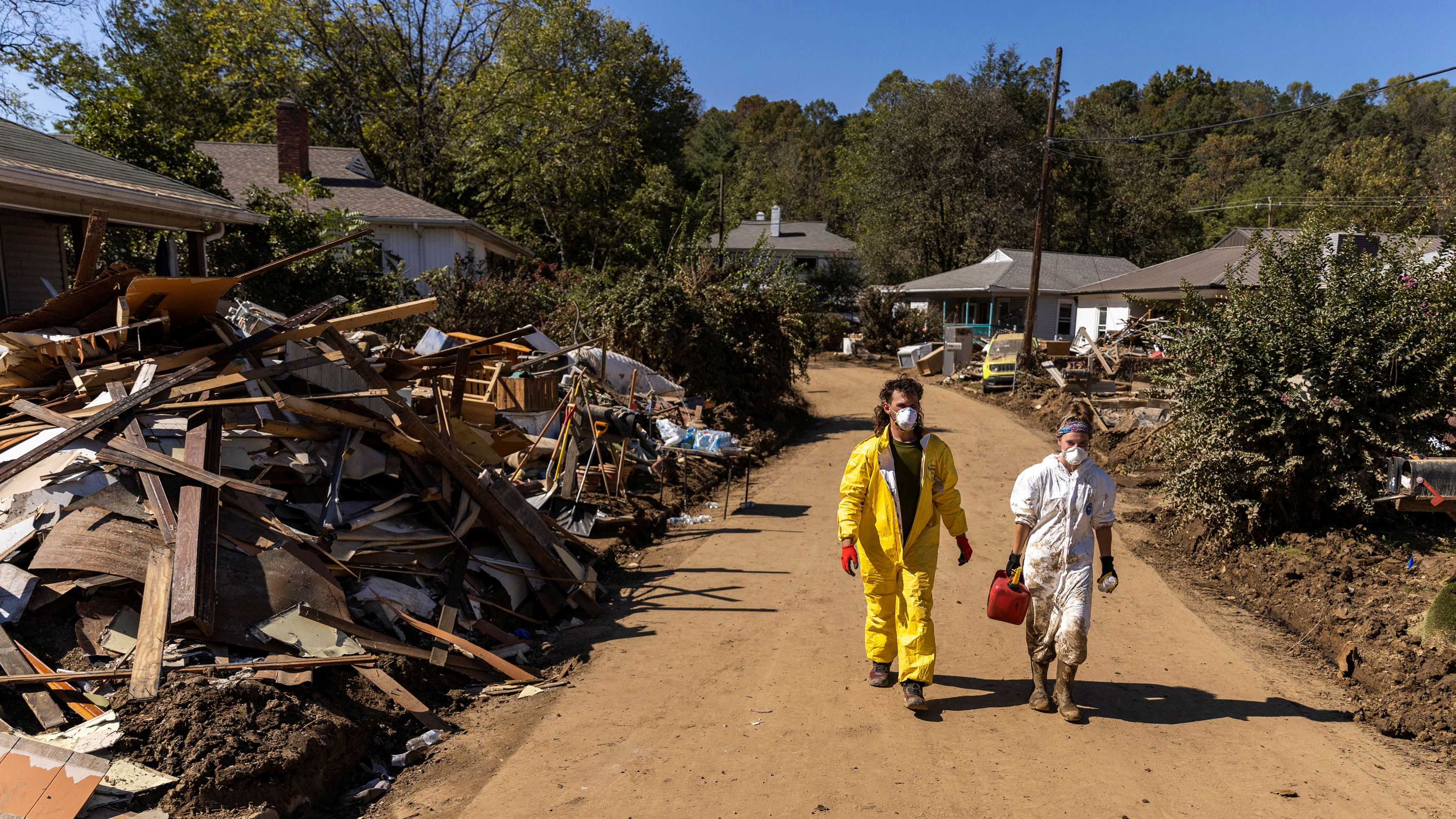 Volunteers walk near debris following the passing of Hurricane Helene, in Swannanoa, North Carolina on October 7, 2024. (Photo by Eduardo Munoz/Reuters)