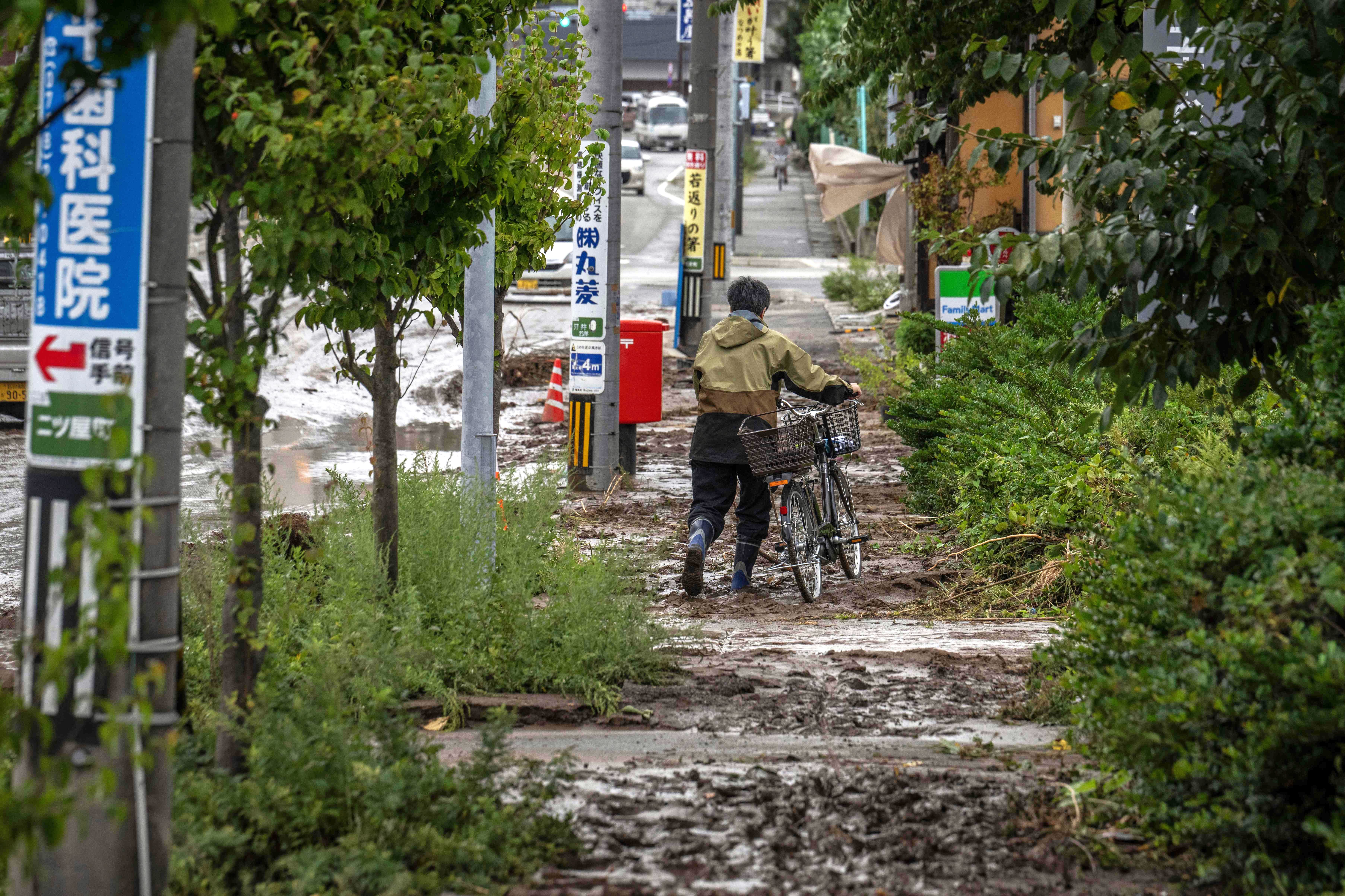 A man pushes his bicycle along a muddy sidewalk following heavy rain in Wajima city of Ishikawa prefecture on September 22, 2024. Heavy rain lashed central Japan on September 22, with floods and landslides leaving one dead and at least six missing in an area already devastated by a major earthquake this year. (Photo by Yuichi Yamazaki/AFP Photo)