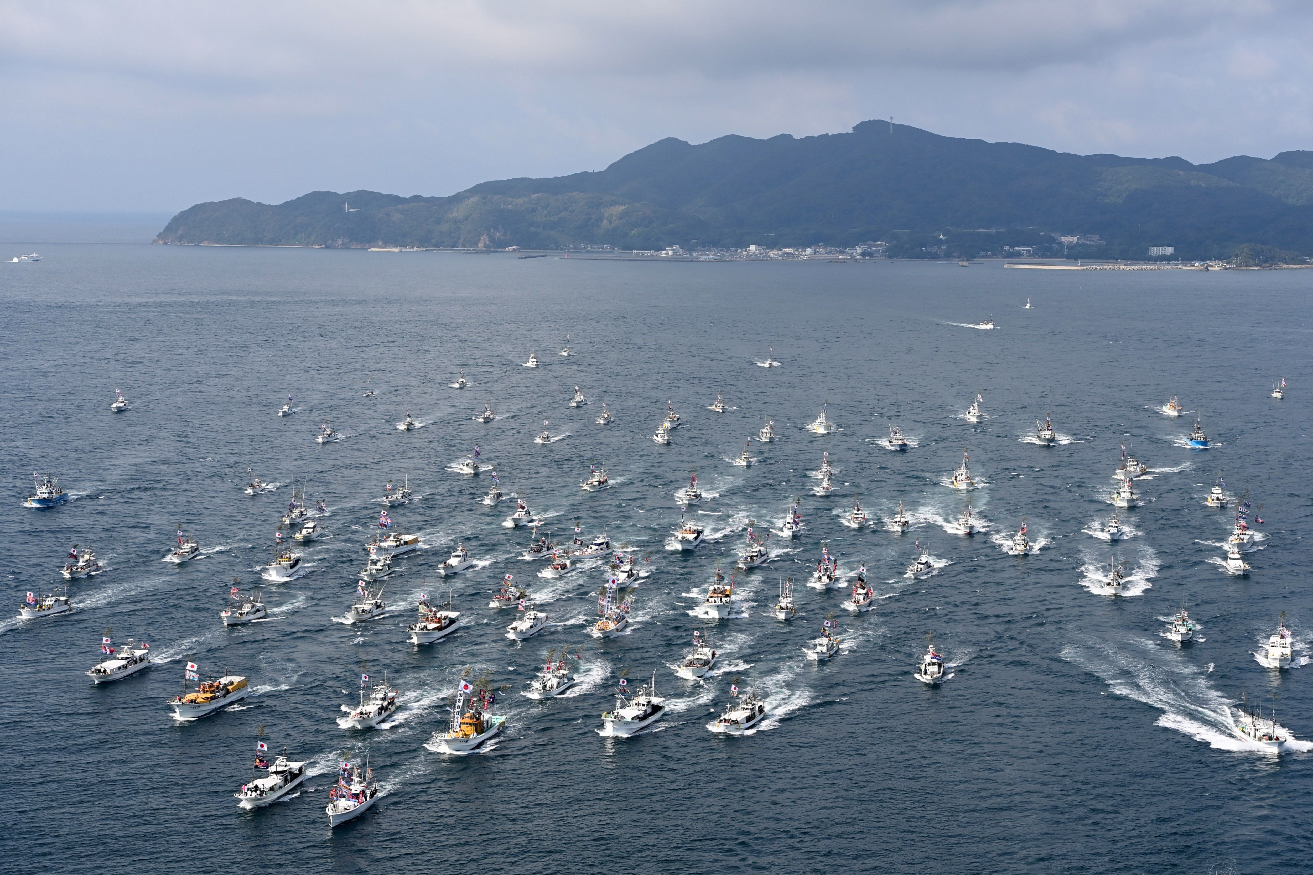 n this aerial image, fish boats parade during the Miare Festival, in hope of good catch as a part of Munakata Taisha Shrine's Autumn Festival on October 1, 2024 in Munakata, Fukuoka, Japan. (Photo by The Asahi Shimbun via Getty Images)