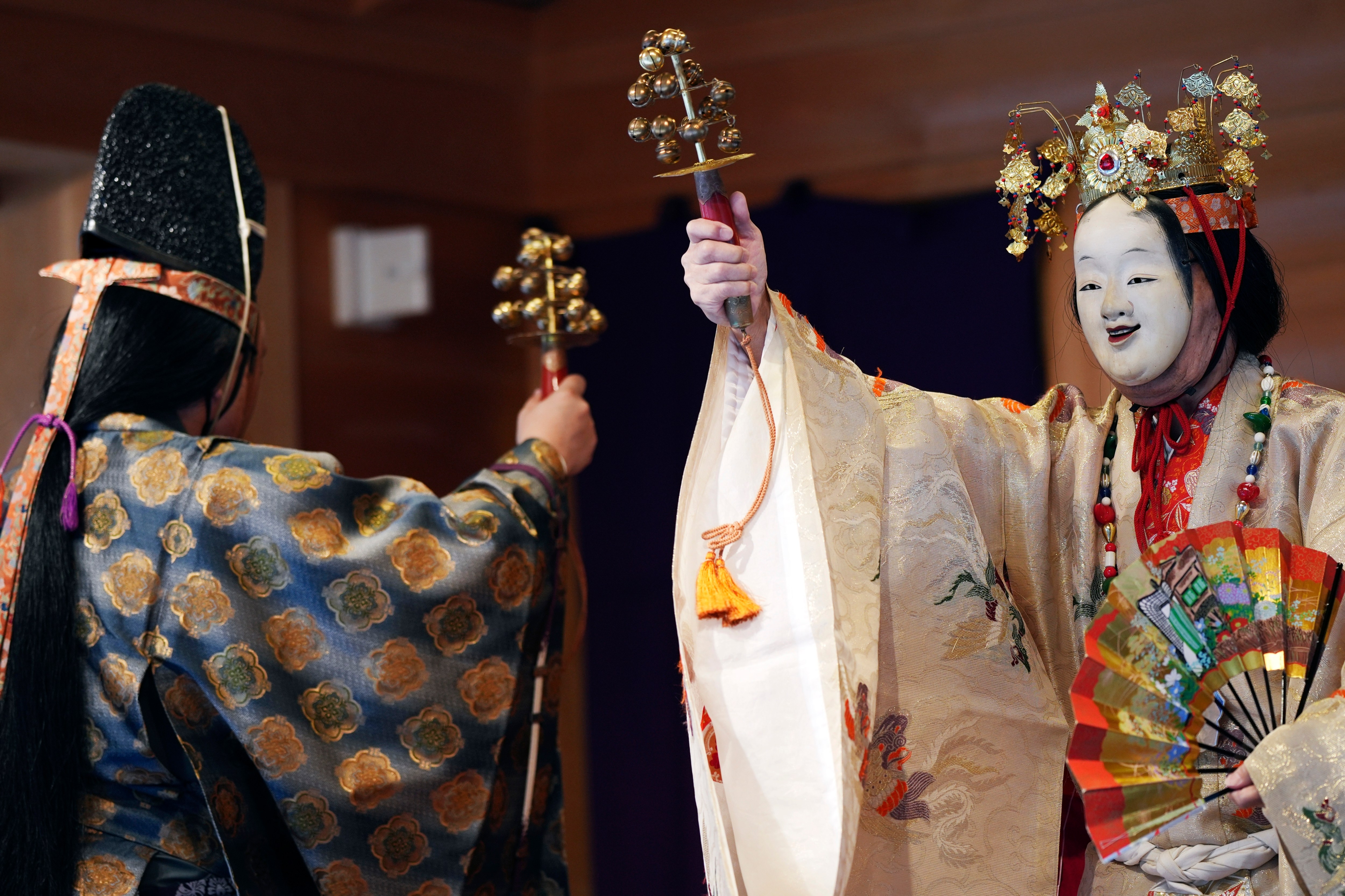 Dancers perform a “Noh” dance-drama during the annual Shinto festival called the Grand Festival at the Kotohiragu shrine in the Toranomon business district of Tokyo, Thursday, October 10, 2024. (Phoot by Eugene Hoshiko/AP Photo)