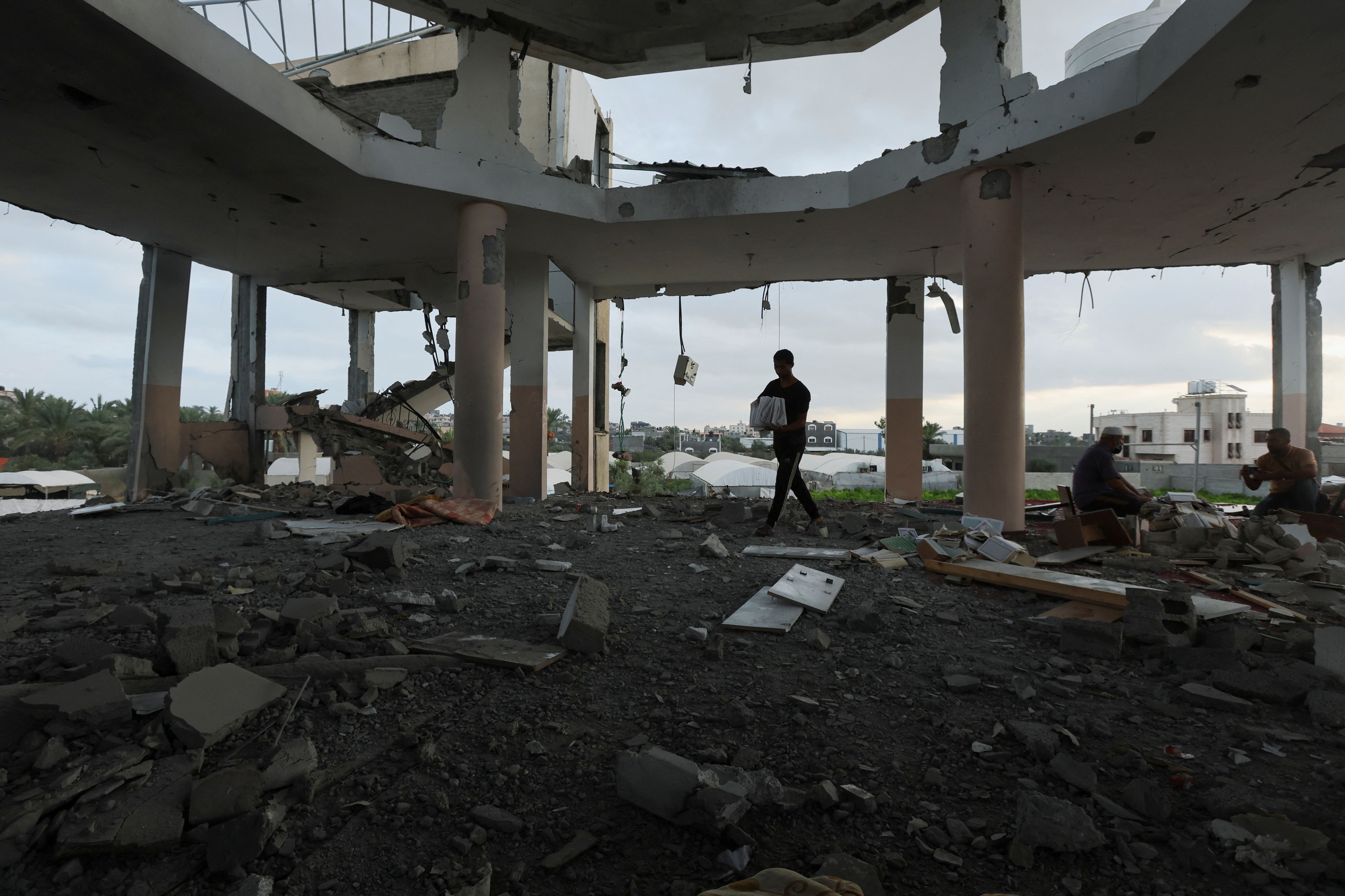 A Palestinian walks with copies of Koran at the site of an Israeli strike on a mosque sheltering displaced people, amid Israel-Hamas conflict, in Deir Al-Balah, in the central Gaza Strip, on October 6, 2024. (Photo by Ramadan Abed/Reuters)