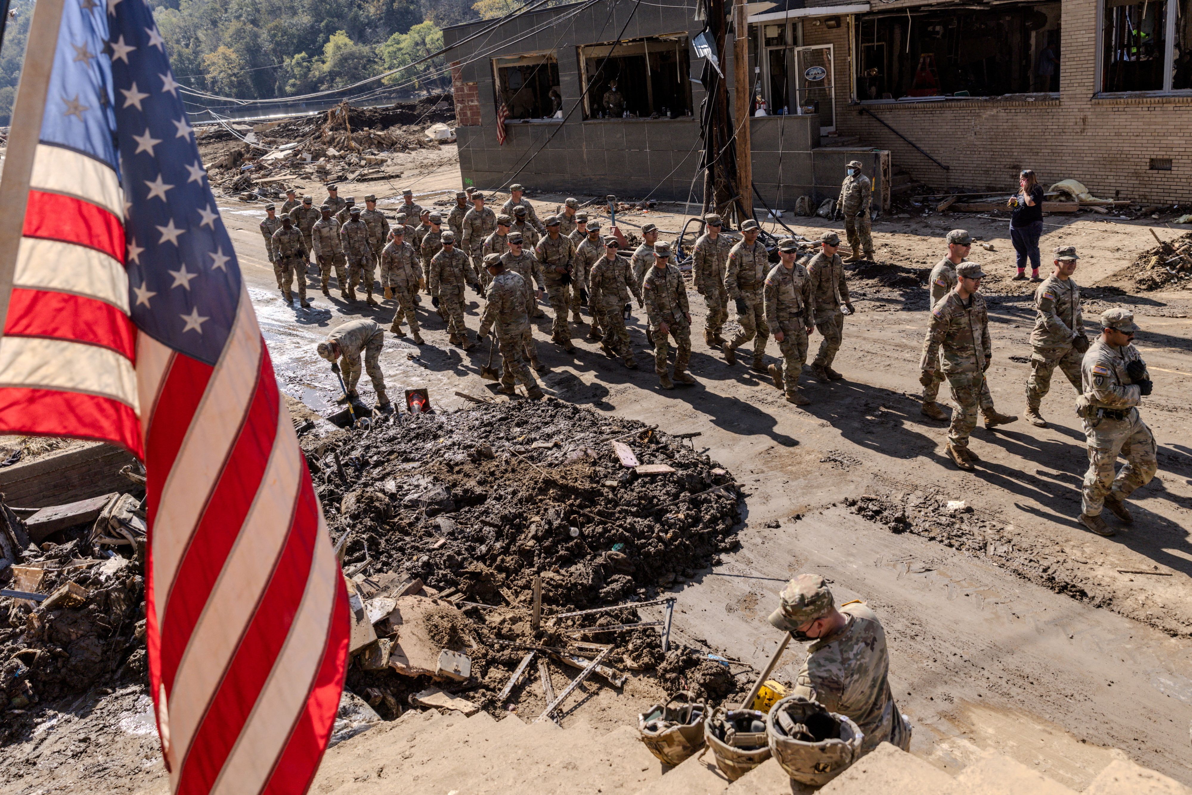 Army soldiers from 1st Battalion, 502nd Infantry Regiment, 101st Airborne Division arrive to help residents to remove debris and clean the area following the passing of Hurricane Helene, in Marshall, North Carolina, U.S., October 8, 2024. (Photo by Eduardo Munoz/Reuters)