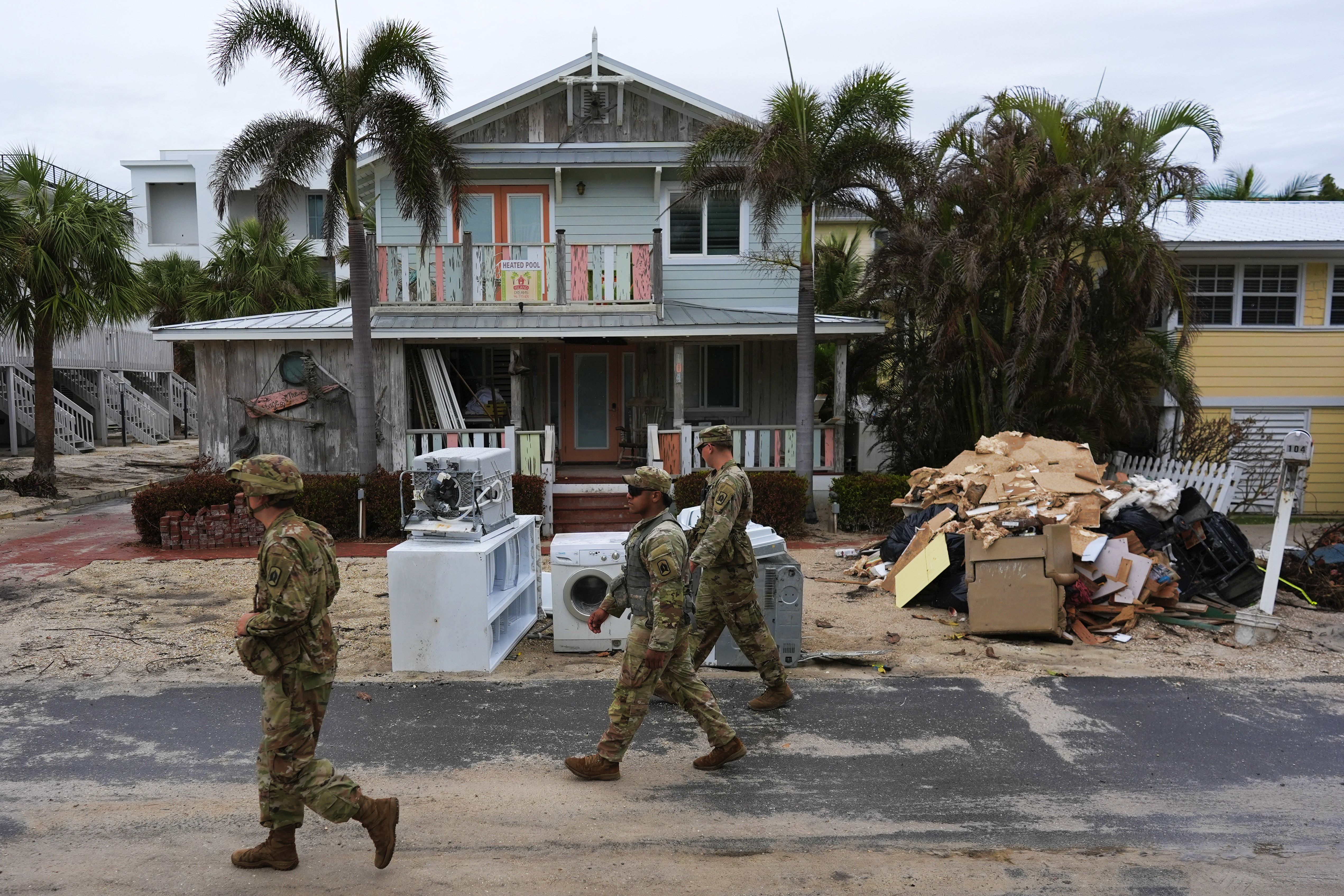 Members of the Florida Army National Guard check for any remaining residents in nearly-deserted Bradenton Beach, where piles of debris from Hurricane Helene flooding still sits outside damaged homes ahead of the arrival of Hurricane Milton, Tuesday, October 8, 2024, on Anna Maria Island, Fla. (Photo by Rebecca Blackwell/AP Photo)