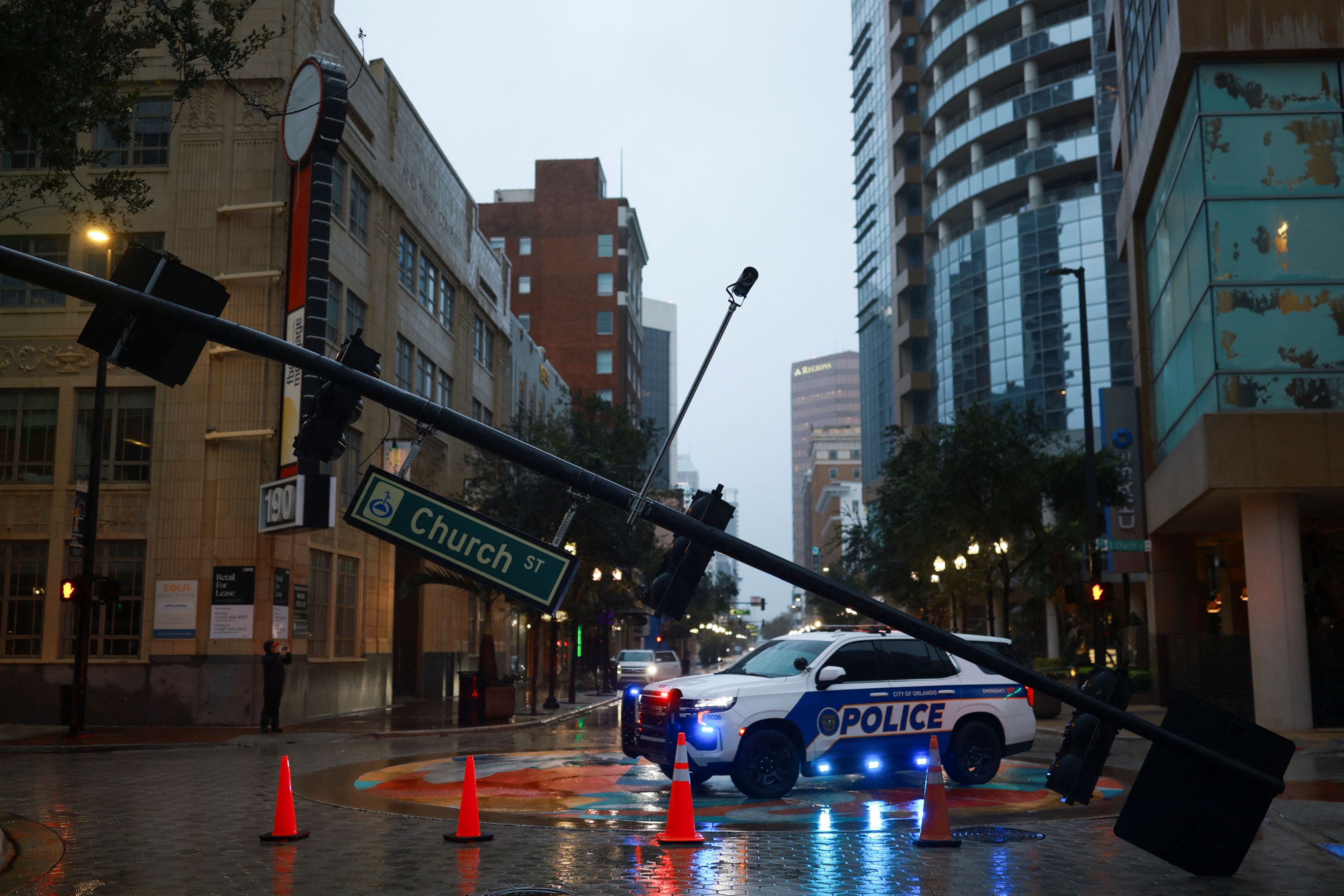A view shows a fallen traffic light near a police car, after Hurricane Milton made landfall in Florida, in Orlando on October 10, 2024. (Photo by Jose Luis Gonzalez/Reuters)