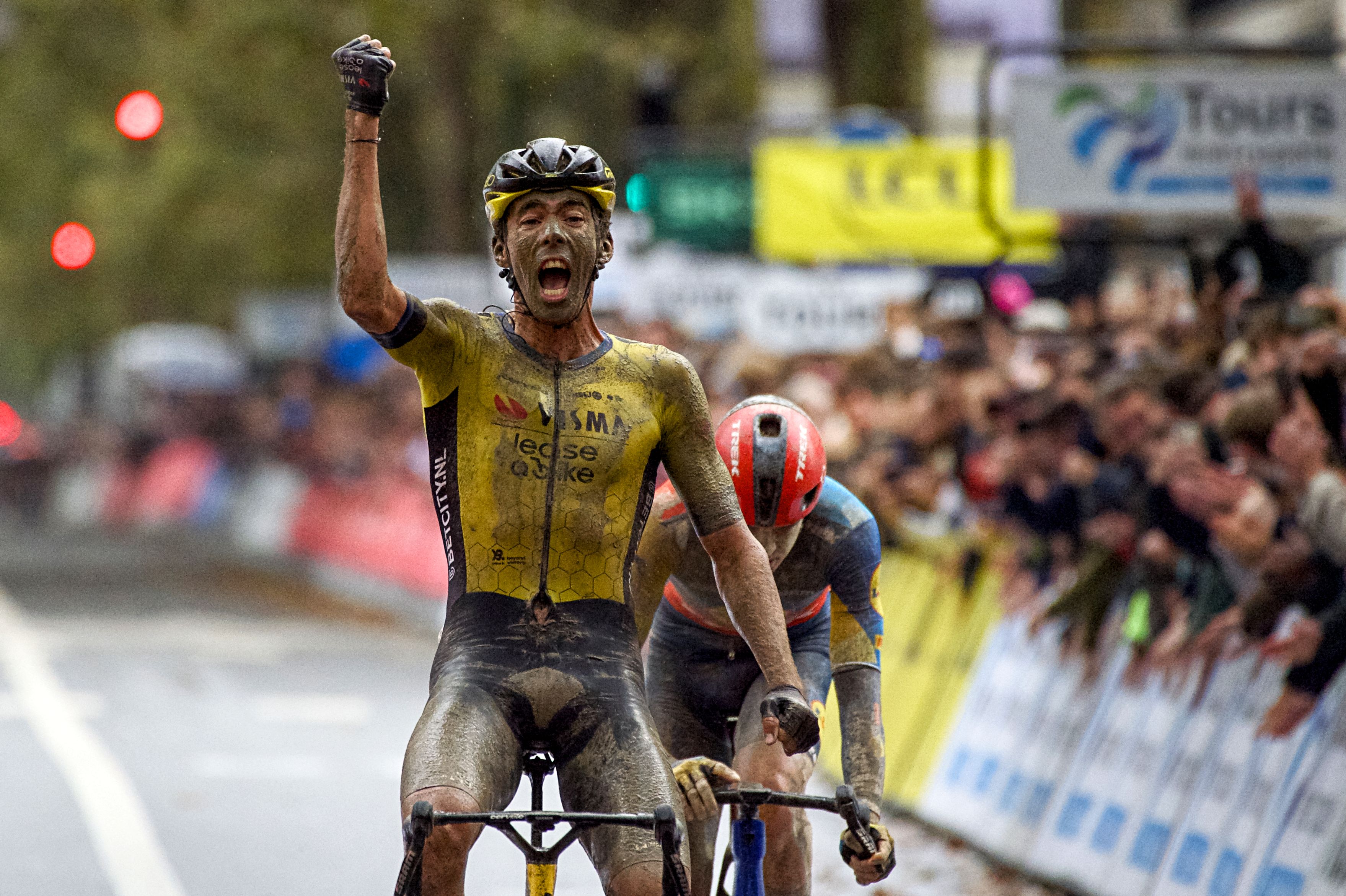 French rider of team Visma Lease A Bike Christophe Laporte reacts as he crosses the finish line ahead of Czeck rider of team Lidl-Treck Mathias Vacek (R) to win the 118th edition of the 213,9 km Paris-Tours one day cycling race, in Tours, central France on October 6, 2024. (Photo by Guillaume Souvant/AFP Photo)