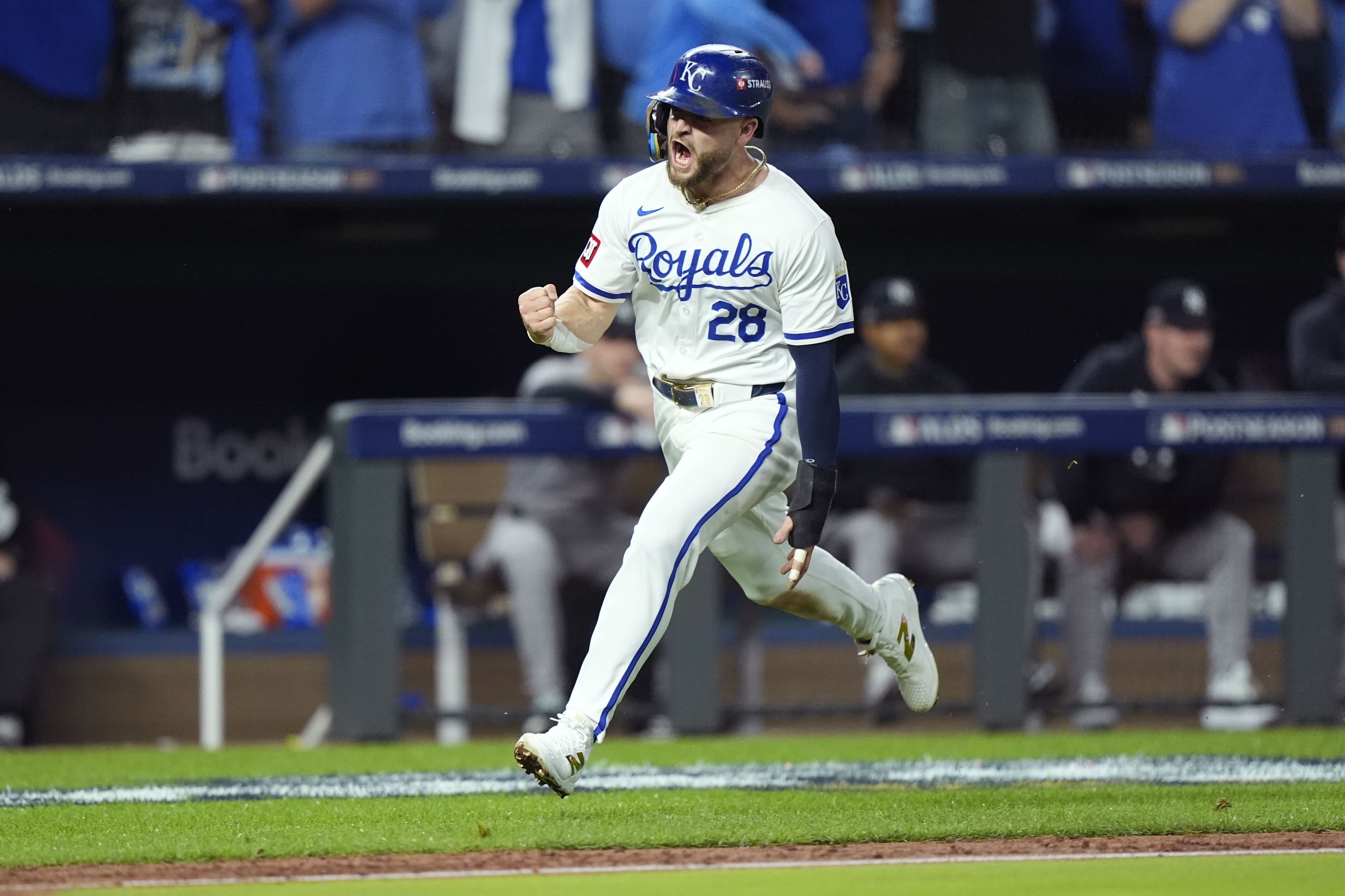 Kansas City Royals' Kyle Isbel (28) celebrates as he runs home to score on a triple by teammate Michael Massey during the fifth inning in Game 3 of an American League Division baseball playoff series against the New York Yankees Wednesday, October 9, 2024, in Kansas City, Mo. (Photo by Charlie Riedel/AP Photo)