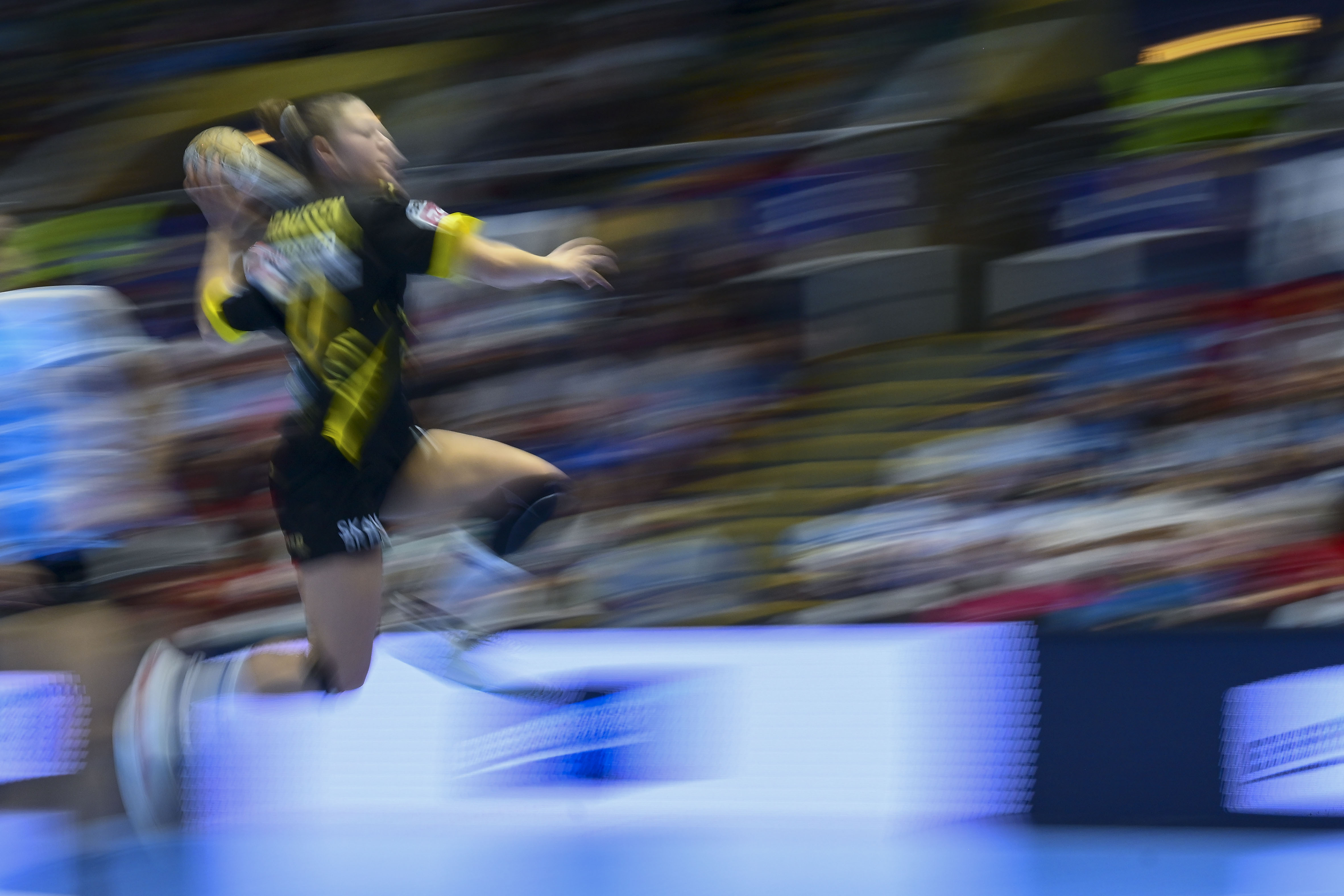In this image taken with a slow shutter speed, Maja Magnussen of Nykobing Falster tries to score during the Champions League women's handball match between CSM Bucuresti and Denmark's Nykobing Falster, at the Polyvalent Hall in Bucharest, Romania, Sunday, October 6, 2024. (Photo by Raed Krishan/AP Photo)