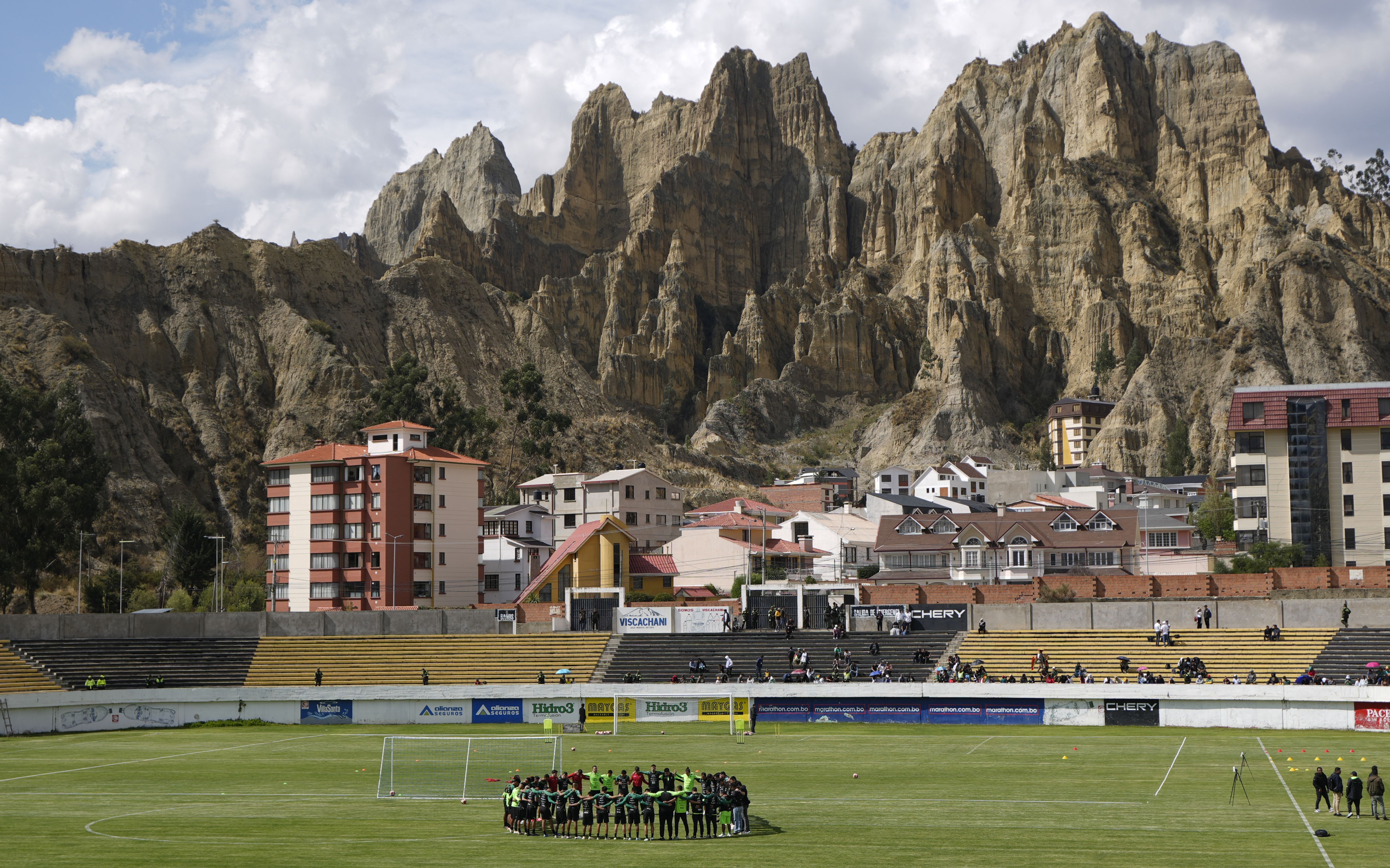 Bolivia's national soccer team huddles during a training season ahead of a World Cup qualifier against Colombia, in La Paz, Bolivia, Wednesday, October 9, 2024. (Photo by Juan Karita/AP Photo)