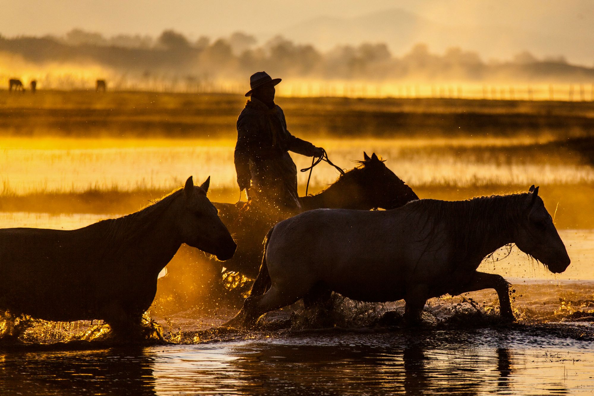 A man riding a horse crosses a river with other horses in the morning in Chifeng, in northern China's Inner Mongolia region on September 22, 2024. (Photo by AFP Photo/China Stringer Network)