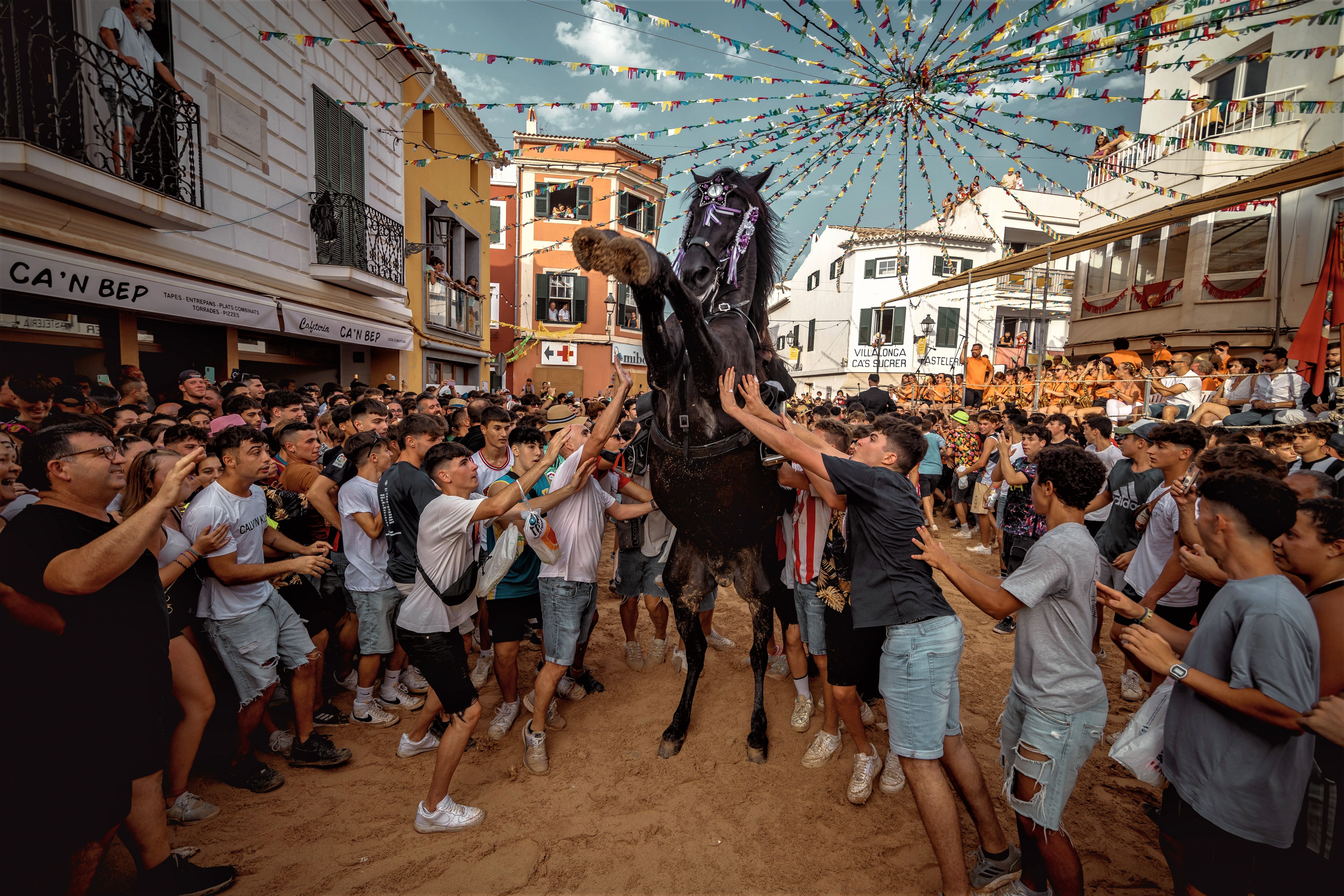A “caixer” (horse rider) rears up on his horse surrounded by a cheering crowd during the traditional “Jaleo” at the Sant Marti Festival in Es Mercadal, Spain on July 15, 2023. (Photo by Matthias Oesterle/Rex Features/Shutterstock)