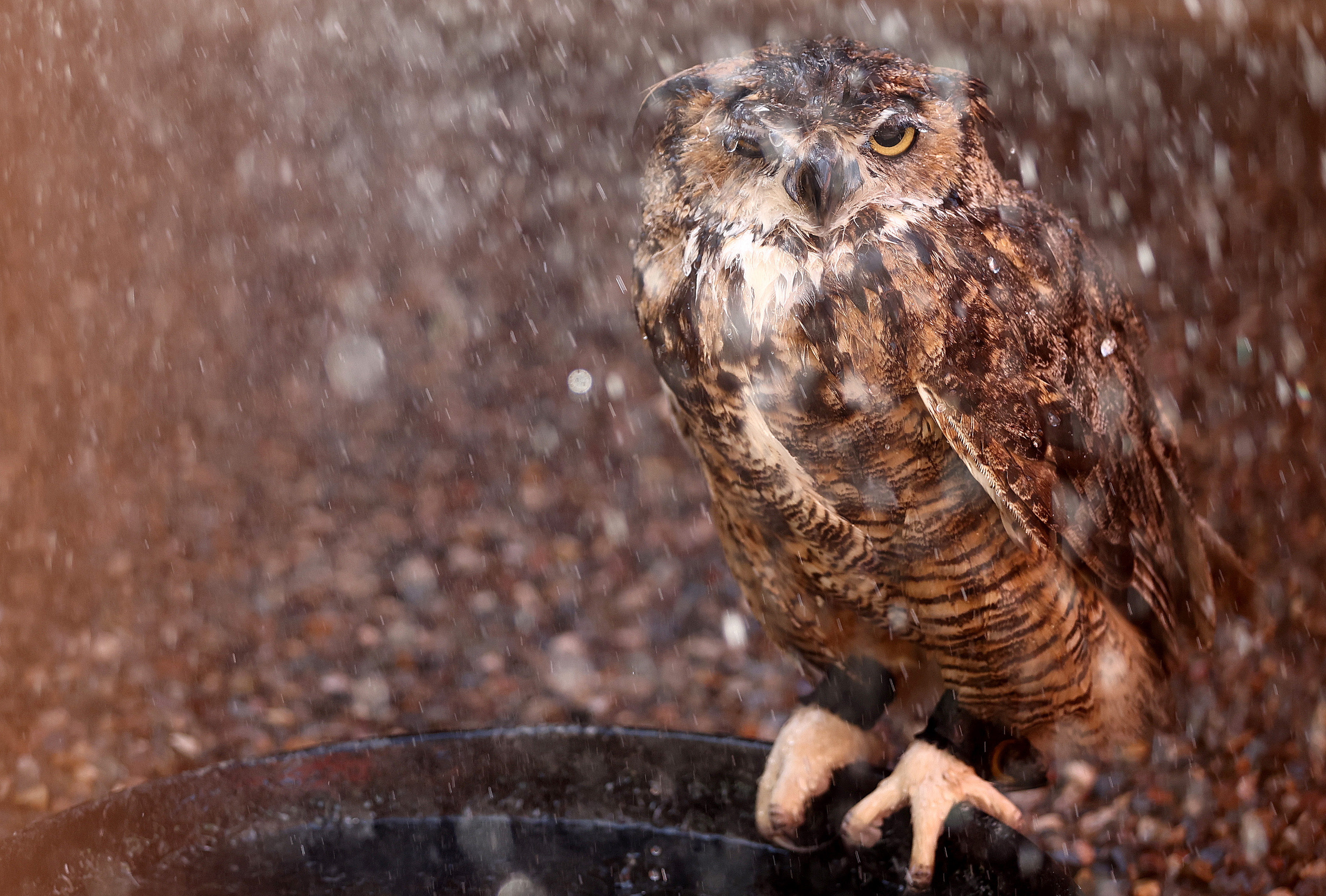 Snickers, a great horned owl, is cooled down with water by a volunteer at Liberty Wildlife, an animal rehabilitation center and hospital, during afternoon temperatures above 110 degrees amid the city's worst heat wave on record on July 26, 2023 in Phoenix, Arizona. Employees and volunteers spray down the birds with water twice per day in the afternoon, while also utilizing fans and swamp coolers, to prevent them from overheating. While Phoenix endures periods of extreme heat every year, today marked the 27th straight day of temperatures reaching 110 degrees or higher, a new record amid a long duration heat wave in the Southwest. (Photo by Mario Tama/Getty Images)