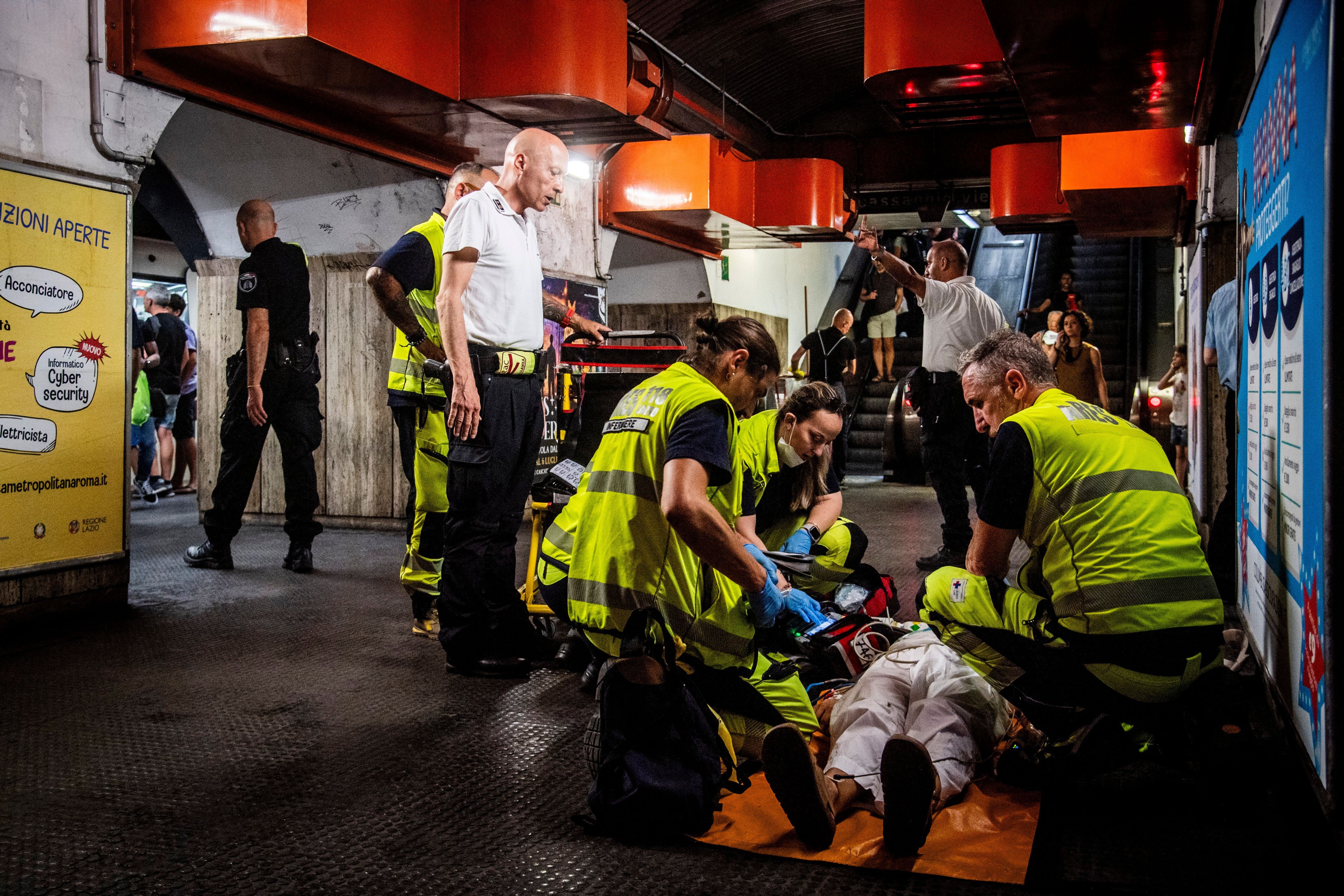 Emergency service staff provide relief for people affected by heat stroke in Rome, Italy on July 18, 2023, as temperatures in Rome hit 41C. (Photo by Alessandro Serranv/Rex Features/Shutterstock)
